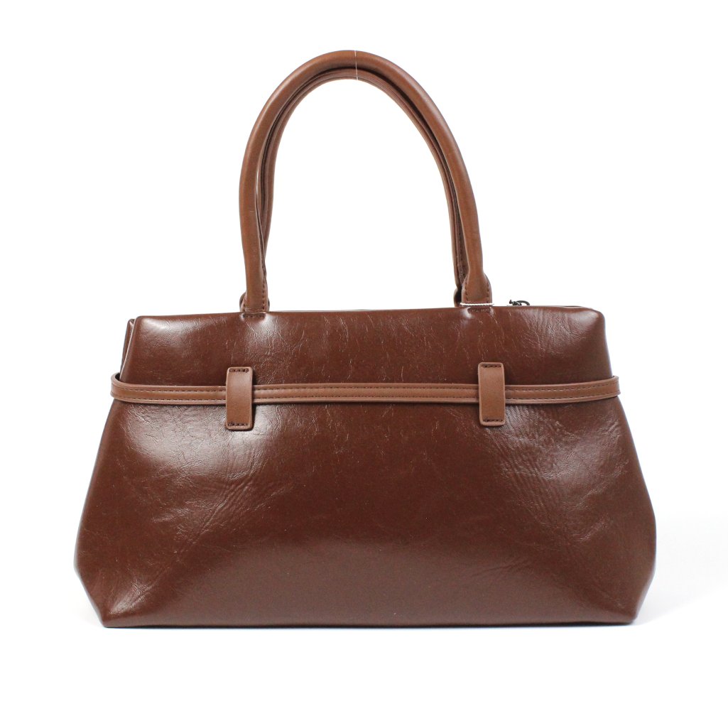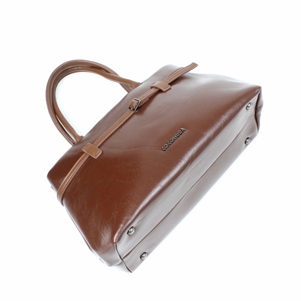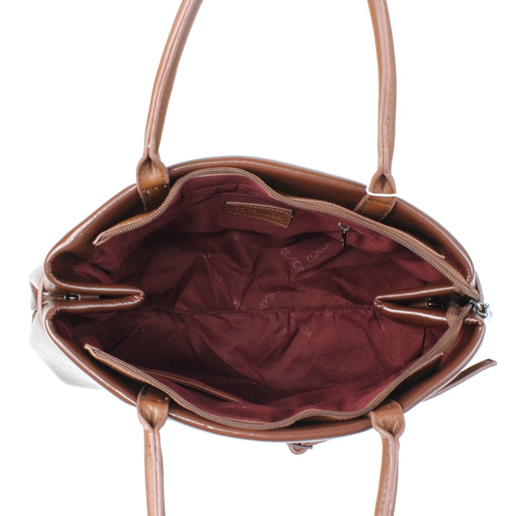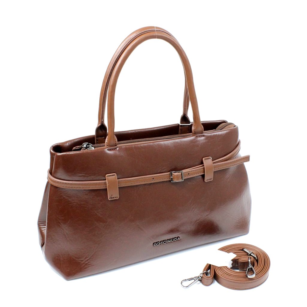 Borsa a mano Coconuda marrone lucida si distingue per il suo design essenziale e raffinato, realizzata in similpelle marrone dalla texture lucida, è impreziosita da una sottile cintura con fibbia sul davanti, dando la possibilità, di aumentarne la capienza. Lo spazio interno è ampio e ben organizzato, pensato per contenere tutto il necessario, ai lati sono presenti tre tasche, una con zip e due aperte. I doppi manici rigidi garantiscono una comoda presa, inoltre, è dotata di tracolla rimovibile e regolabile. La struttura capiente e ben definita la rende ideale per chi cerca una borsa funzionale senza rinunciare all’eleganza, perfetta per completare look da giorno e da ufficio con un tocco di classe.