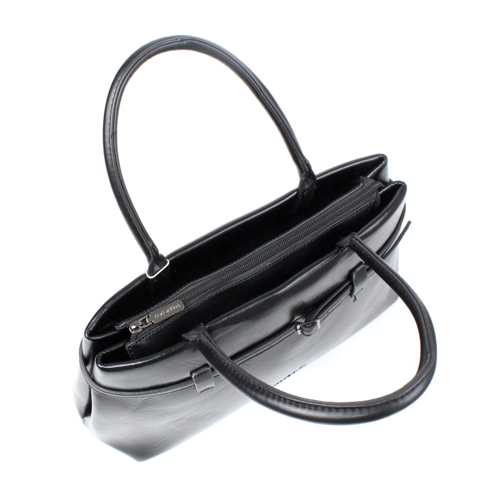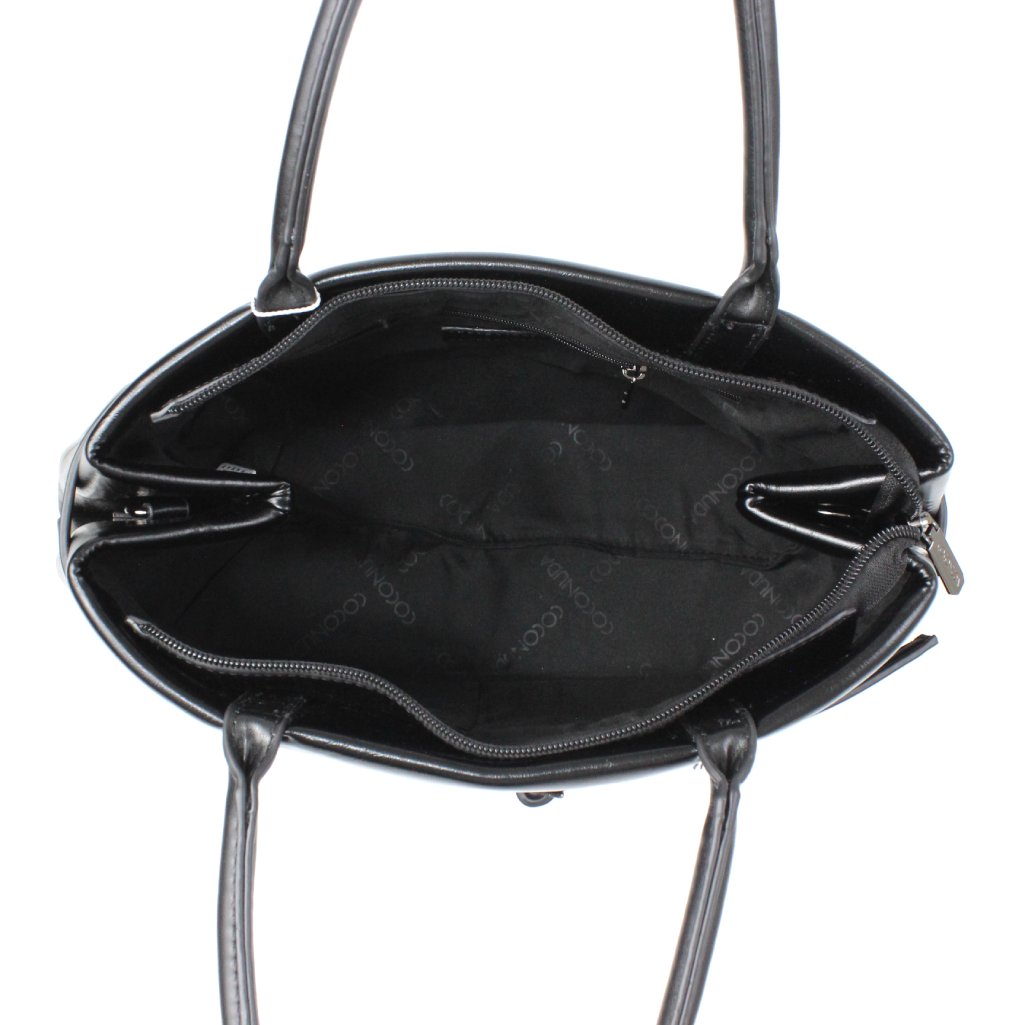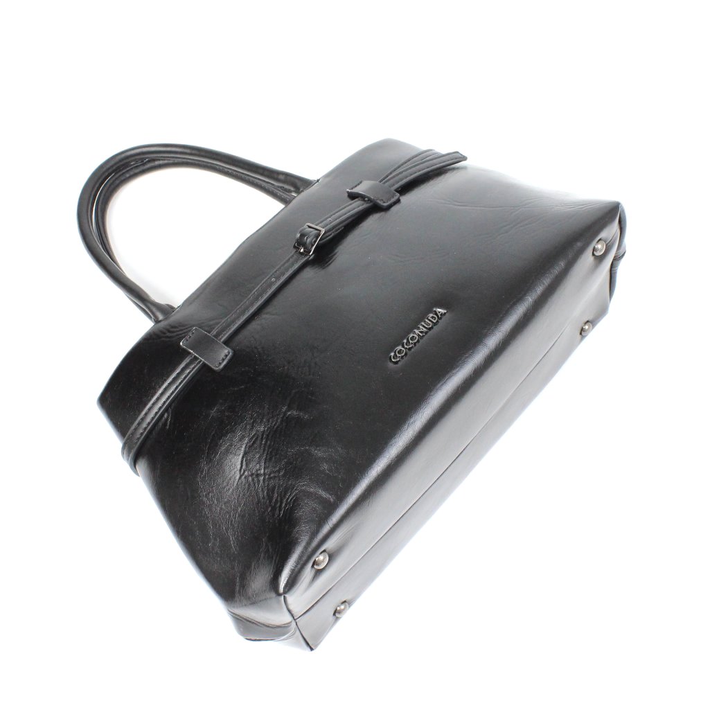 Borsa a mano Coconuda nera lucida si distingue per il suo design essenziale e raffinato, realizzata in similpelle nera dalla texture lucida, è impreziosita da una sottile cintura con fibbia sul davanti, dando la possibilità, di aumentarne la capienza. Lo spazio interno è ampio e ben organizzato, pensato per contenere tutto il necessario, ai lati sono presenti tre tasche, una con zip e due aperte. I doppi manici rigidi garantiscono una comoda presa, inoltre, è dotata di tracolla rimovibile e regolabile. La struttura capiente e ben definita la rende ideale per chi cerca una borsa funzionale senza rinunciare all’eleganza, perfetta per completare look da giorno e da ufficio con un tocco di classe.