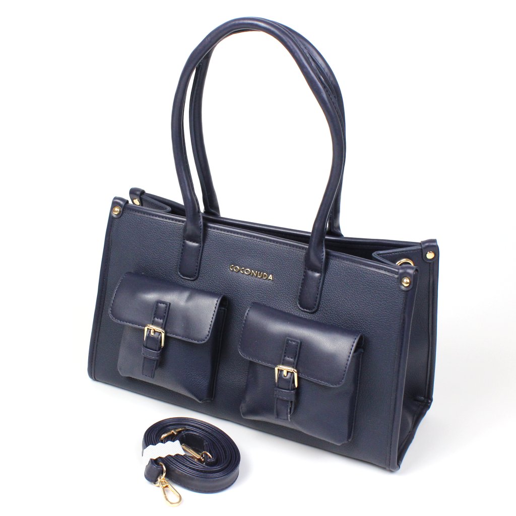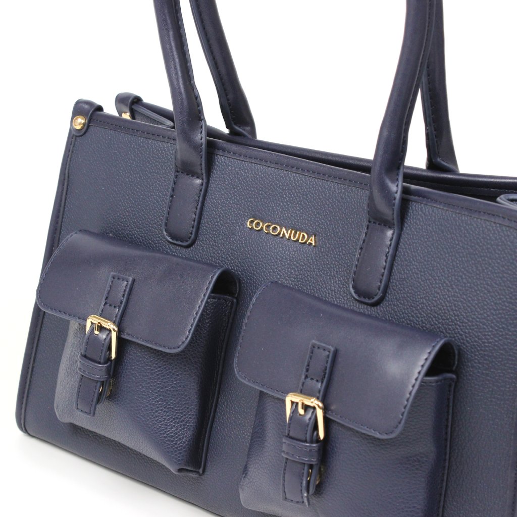 Borsa blu Coconuda con tasche frontali si caratterizza per uno stile elegante e deciso, ideale per chi cerca un accessorio raffinato ma pratico per l’uso quotidiano. Sul fronte spiccano le tasche applicate con chiusura magnetica e dettagli metallici dorati, mentre sul retro è presente una comoda tasca con cerniera, perfetta per riporre gli oggetti da avere sempre a portata di mano. L’interno è ben organizzato e offre uno spazio funzionale con una tasca a soffietto e una tasca con zip, ideali per tenere tutto in ordine. I manici consentono di portarla comodamente a mano o a spalla, mentre la tracolla inclusa, rimovibile e regolabile, permette di indossarla anche a tracolla, adattandosi con versatilità a diverse esigenze di stile e comfort.