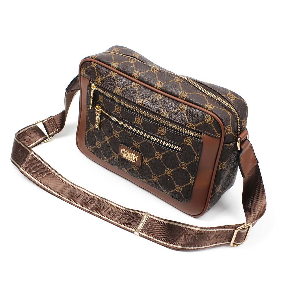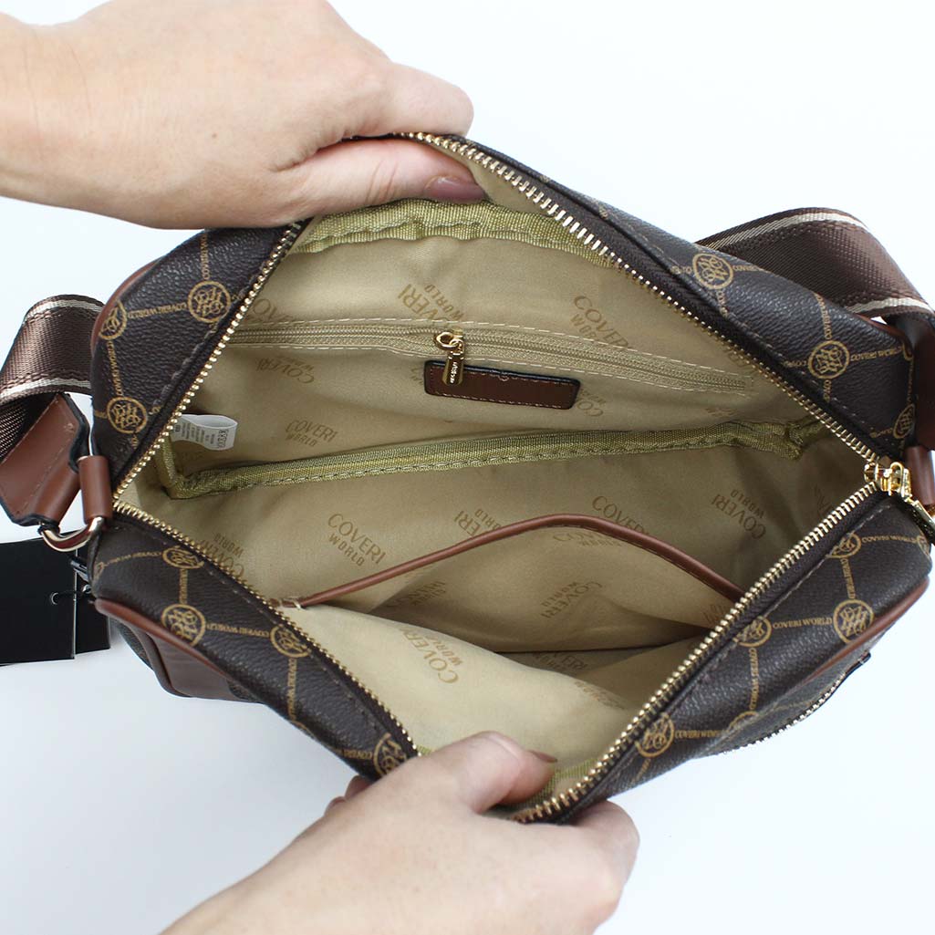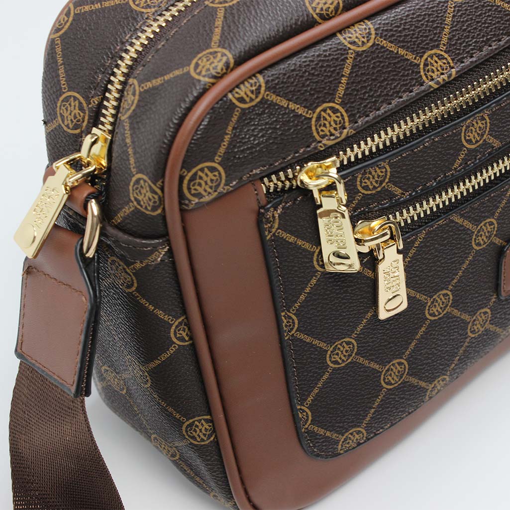 Borsa Coveri World marrone con logo è realizzata in ecopelle con un elegante motivo geometrico e dettagli dorati. La forma rettangolare la rende perfetta per un uso quotidiano, mantenendo uno stile moderno e di tendenza. Sul davanti presenta due tasche esterne con chiusura a zip, arricchita da una targhetta dorata con il logo Coveri World. La tracolla regolabile offre una comoda vestibilità a spalla o a tracolla. Sul retro è presente una ulteriore tasca con cerniera mentre all’interno, la borsa è foderata con un tessuto beige e dispone di due pratiche tasche: una aperta per tenere a portata di mano piccoli oggetti e una con chiusura a zip per conservare in sicurezza gli oggetti più preziosi. Borsa Coveri World marrone con logo è ideale per completare gli outfit di tutti i giorni.