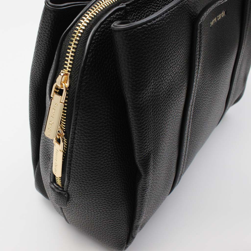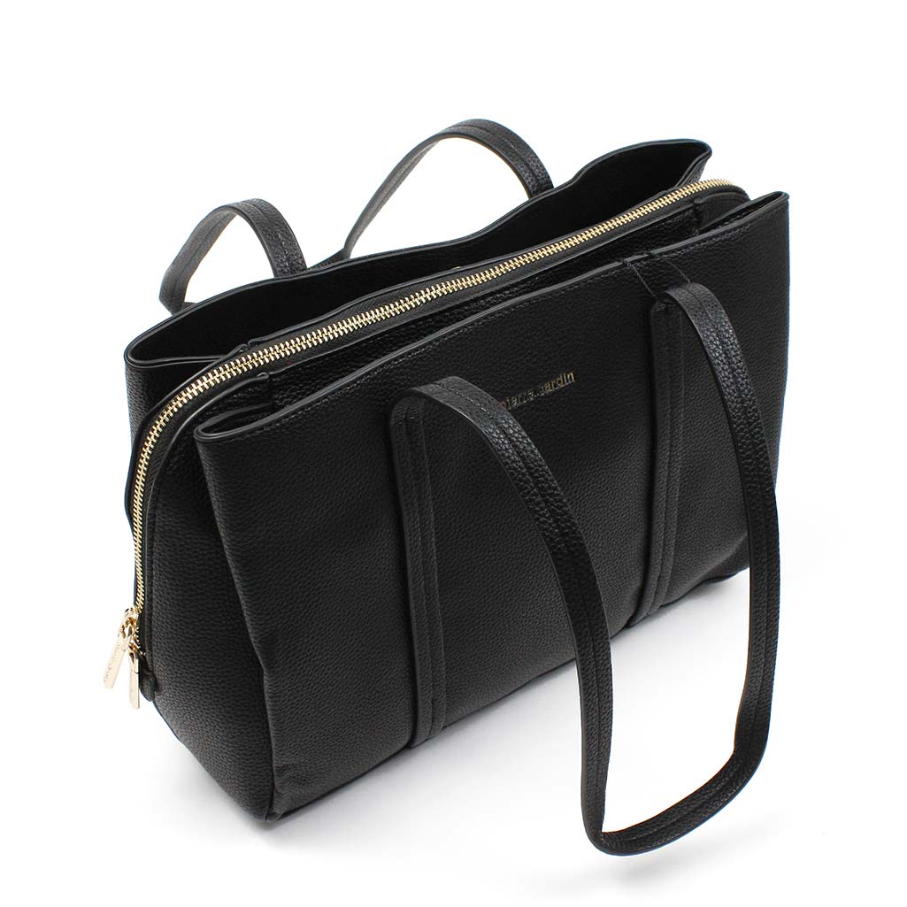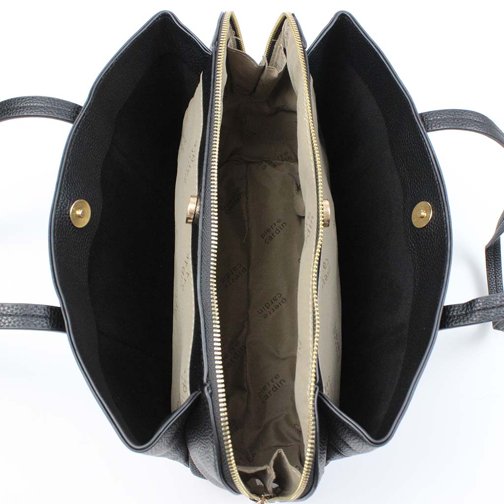 Borsa da spalla nera Pierre Cardin Fiorella realizzata in similpelle martellata, presenta un design elegante e funzionale. I doppi manici alti 28 cm permettono di indossarla comodamente a spalla, offrendo praticità nell’uso quotidiano. Dotata di tre scomparti indipendenti, due con chiusura a bottone magnetico mentre il centrale è chiuso con una comoda cerniera a doppio cursore. Al suo interno troviamo un ampio spazio con una tasca con cerniera per gli oggetti più piccoli. I dettagli metallici dorati, con logo inciso, aggiungono un tocco elegante e glamour. Borsa da spalla nera Pierre Cardin Fiorella è ideale per outfit casual ma anche per occasioni più formali ed eleganti.