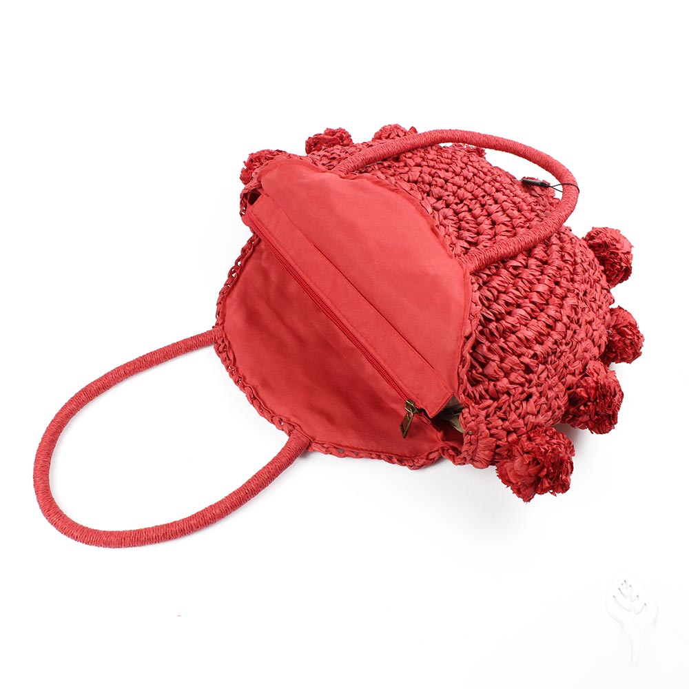 Borsa in paglia rotonda rossa con pompon Kevin Jeans comoda e capiente. Aprendola dalla chiusura con cerniera accediamo al suo interno, qui troviamo un unico grande scomparto con una tasca aperta. La borsa รจ dotata di manici superiori alti 17 cm, comoda da portare a spalla. Pratica e ideale per le serate estive o per le tue giornate in spiaggia.