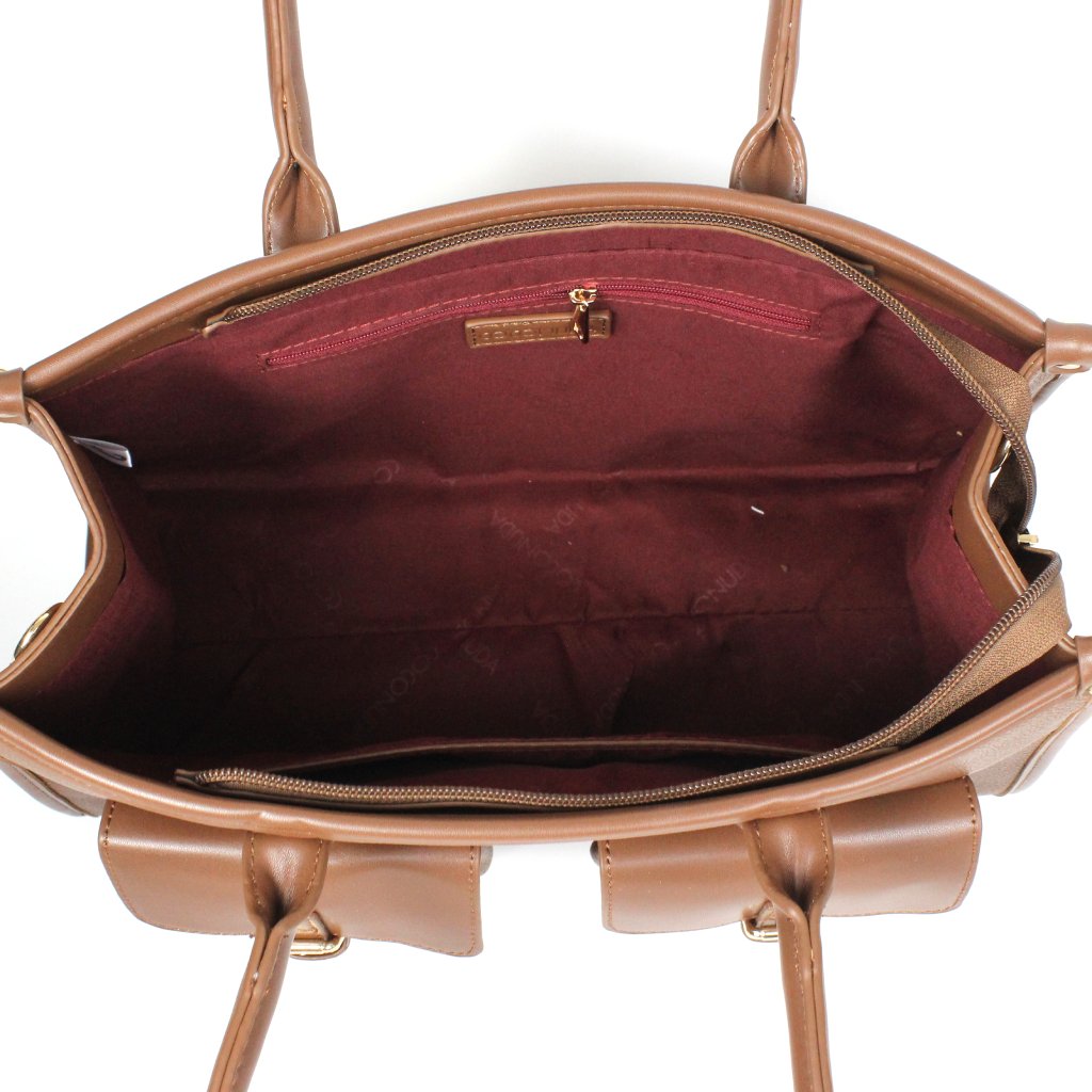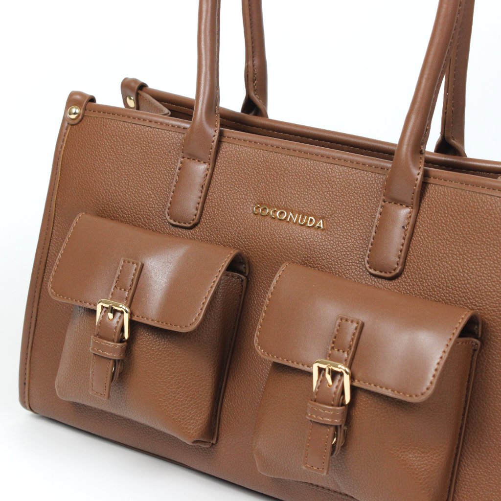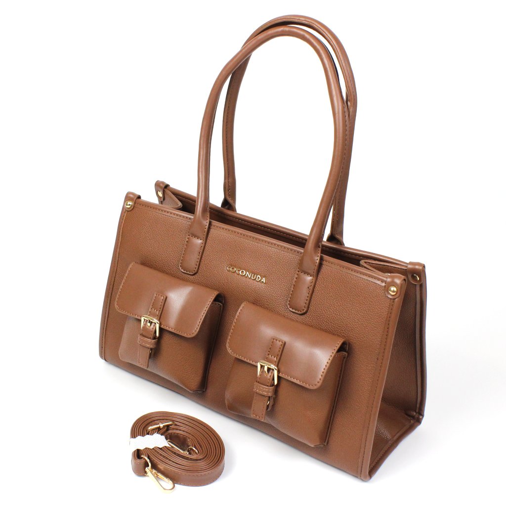Borsa marrone Coconuda con tasche frontali si caratterizza per uno stile elegante e deciso, ideale per chi cerca un accessorio raffinato ma pratico per l’uso quotidiano. Sul fronte spiccano le tasche applicate con chiusura magnetica e dettagli metallici dorati, mentre sul retro è presente una comoda tasca con cerniera, perfetta per riporre gli oggetti da avere sempre a portata di mano. L’interno è ben organizzato e offre uno spazio funzionale con una tasca a soffietto e una tasca con zip, ideali per tenere tutto in ordine. I manici consentono di portarla comodamente a mano o a spalla, mentre la tracolla inclusa, rimovibile e regolabile, permette di indossarla anche a tracolla, adattandosi con versatilità a diverse esigenze di stile e comfort.