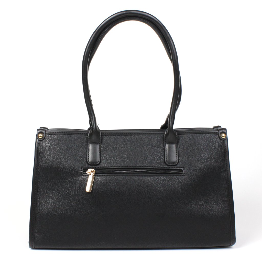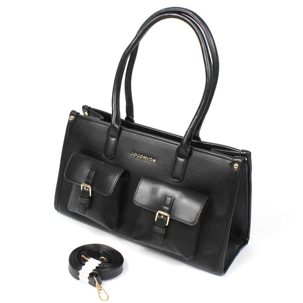 Borsa nera Coconuda con tasche frontali si caratterizza per uno stile elegante e deciso, ideale per chi cerca un accessorio raffinato ma pratico per l’uso quotidiano. Sul fronte spiccano le tasche applicate con chiusura magnetica e dettagli metallici dorati, mentre sul retro è presente una comoda tasca con cerniera, perfetta per riporre gli oggetti da avere sempre a portata di mano. L’interno è ben organizzato e offre uno spazio funzionale con una tasca a soffietto e una tasca con zip, ideali per tenere tutto in ordine. I manici consentono di portarla comodamente a mano o a spalla, mentre la tracolla inclusa, rimovibile e regolabile, permette di indossarla anche a tracolla, adattandosi con versatilità a diverse esigenze di stile e comfort.