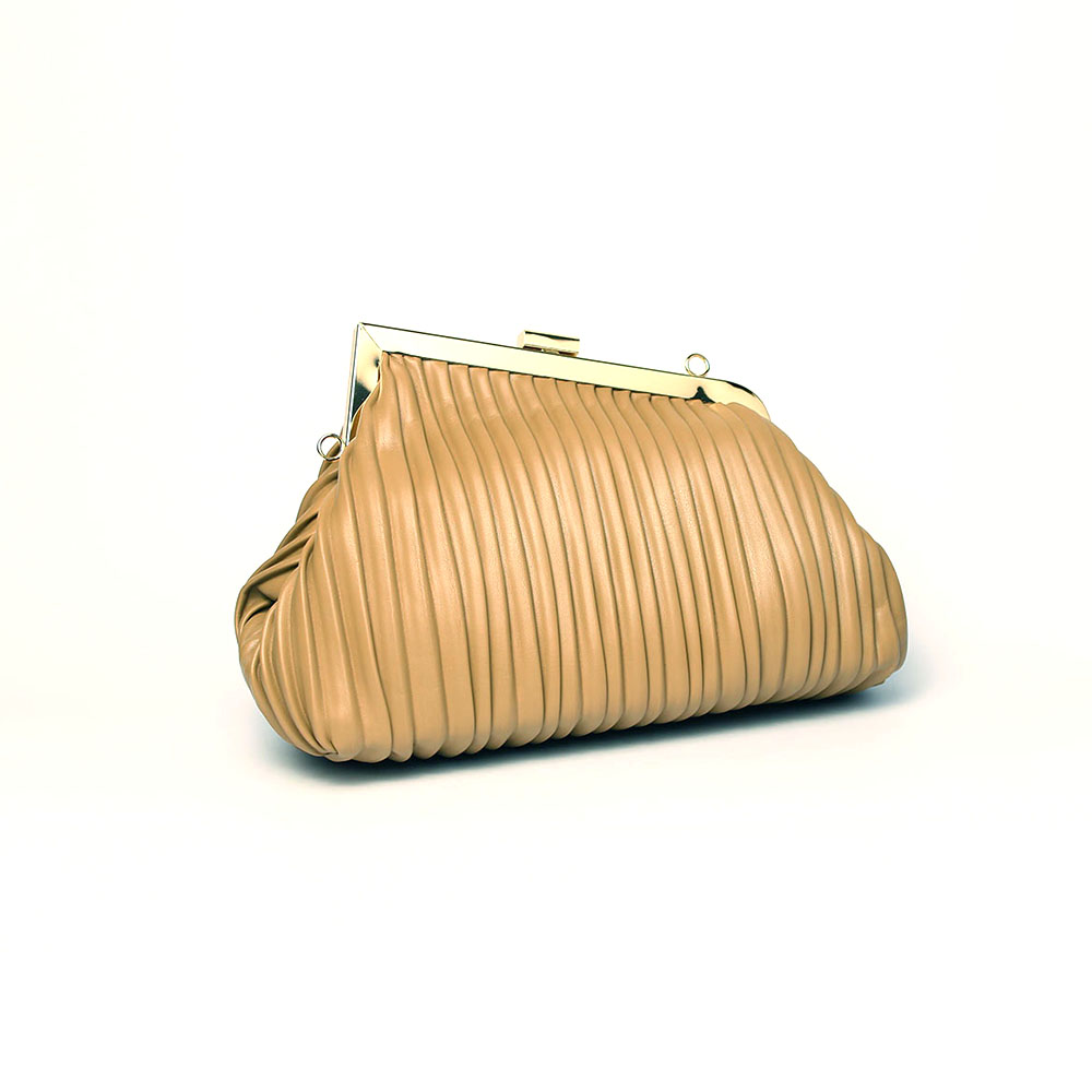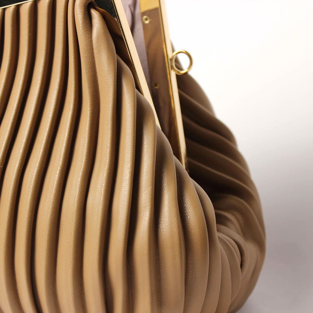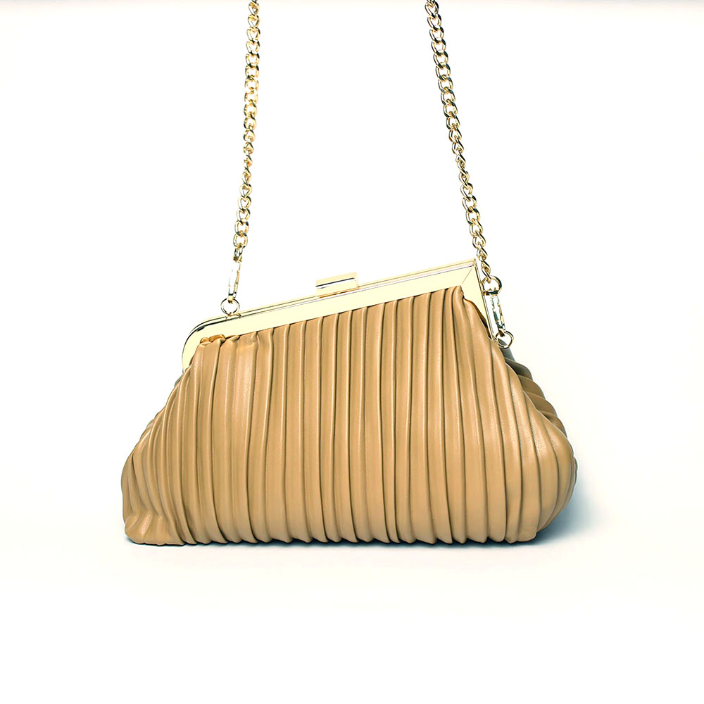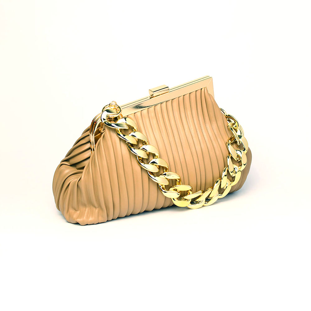 Borsa plissettata beige con catena Glam è realizzata in pelle sintetica di alta qualità, morbida e con texture plissettata.