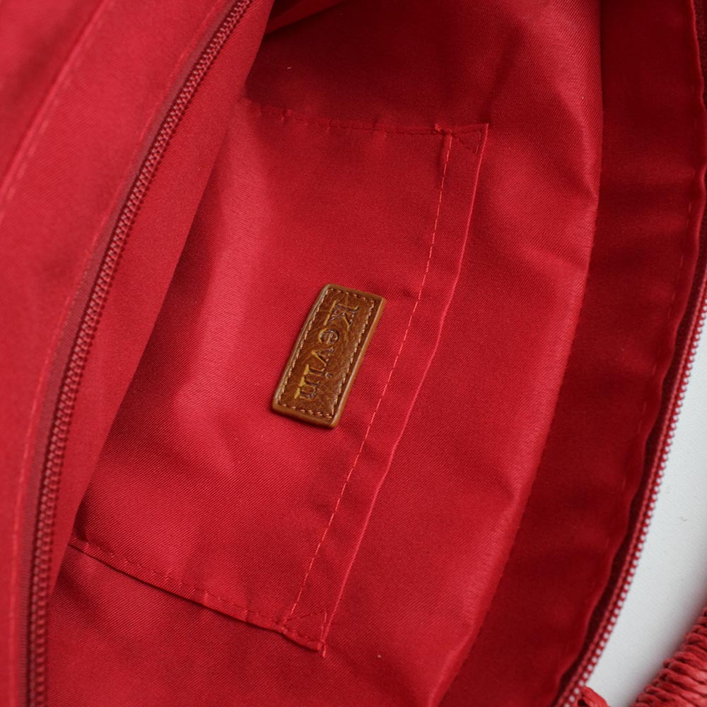 Borsa rossa in paglia Kevin Jeans Pompon, accediamo al suo interno tramite cerniera dove troviamo un unico grande scomparto con una tasca aperta. La borsa è dotata di tracolla in paglia non rimovibile.
