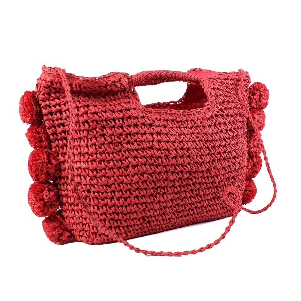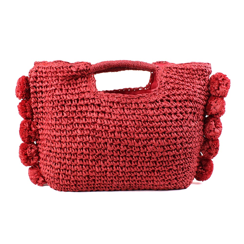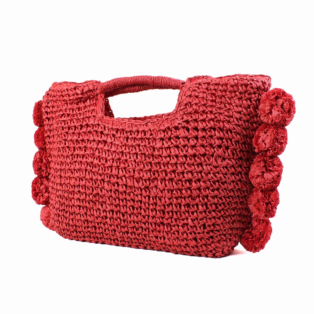 Pratica e perfetta per le serate estive o per le tue giornate in spiaggia, puoi portarla comodamente a mano grazie ai manici superiori alti 7 cm. Borsa rossa in paglia Kevin Jeans Pompon misura 38 x 22 x 13 cm.