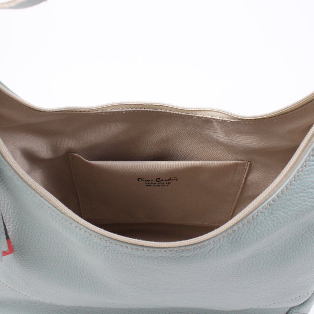 Borsa verde Pierre Cardin a spalla in vera pelle made in Italy. Accediamo al suo interno tramite cerniera dove troviamo un ampio scomparto con una tasca aperta. Elegante e raffinata in un delicato verde salvia, le spalline sono regolabili su 5 diverse lunghezze tramite le fibbie. Tutte le rifiniture metalliche sono in colore argento, perfetta per chi ama le borse capienti e non vuole rinunciare alla qualità, della vera pelle.