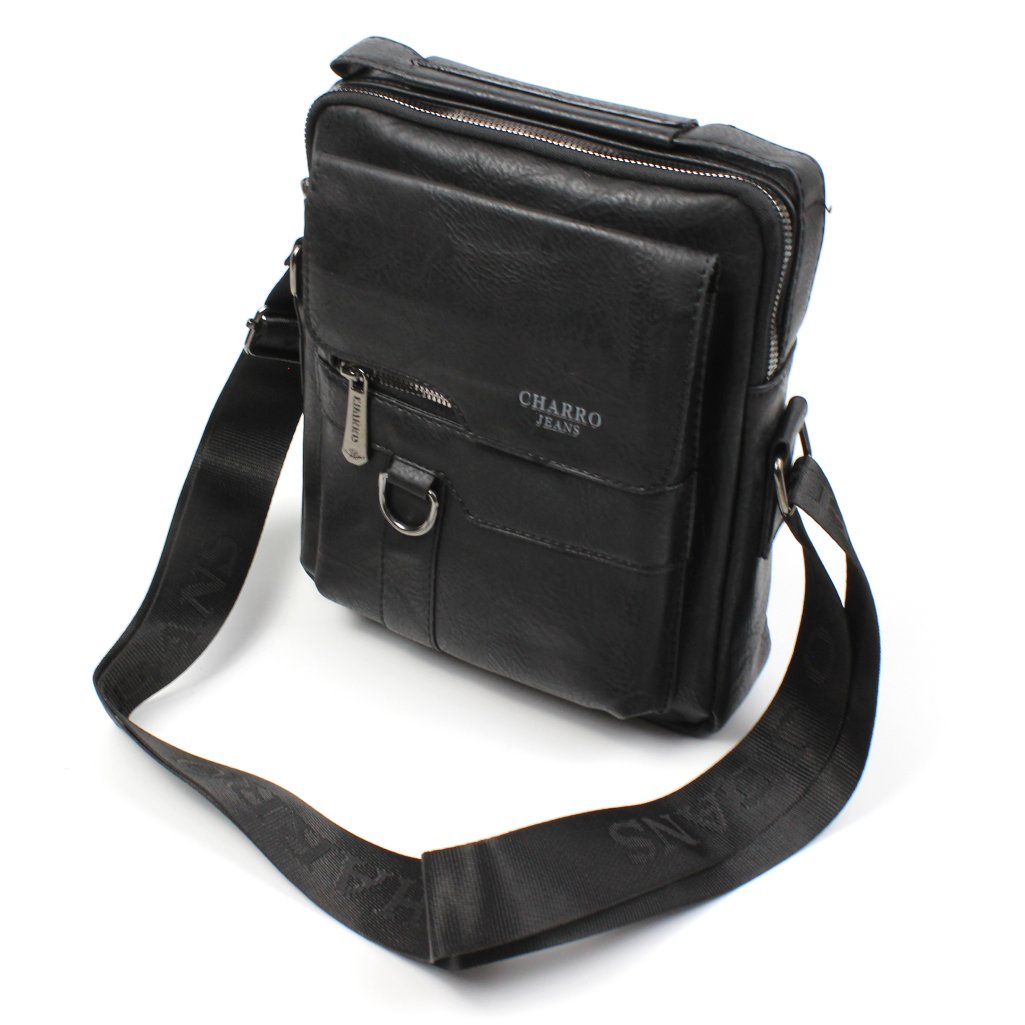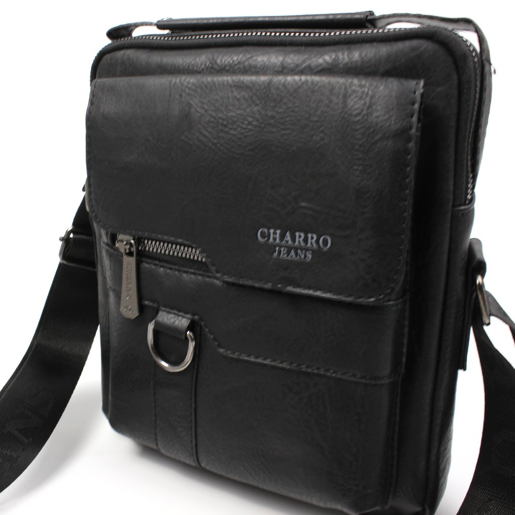 Borsello Charro nero con tasche e logo frontale. Accediamo al suo interno tramite cerniera dove troviamo un comodo taschino con zip. Esternamente presenta due tasche frontali, una chiusa con bottoni magnetici, ed una chiusa con cerniera. Sul retro è presente una ulteriore tasca con zip. Dotato di manico superiore e di tracolla, regolabile secondo le proprie esigenze. Tutte le rifiniture metalliche sono in colore argento scuro con logo inciso.