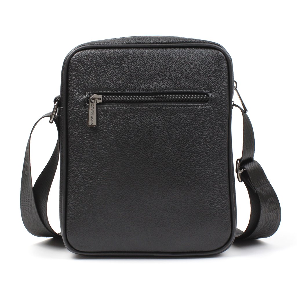 Borsello Coveri World nero con logo in similpelle, presenta tre tasche esterne, due sulla parte frontale ed una sulla parte posteriore, tutte chiuse con cerniera. Ampio scomparto in cui troviamo ulteriori 2 taschini, uno aperto ed uno chiuso con zip. La tracolla con stampa del marchio รจ regolabile secondo le proprie esigenze. Tutte le rifiniture metalliche sono in color argento con logo inciso.