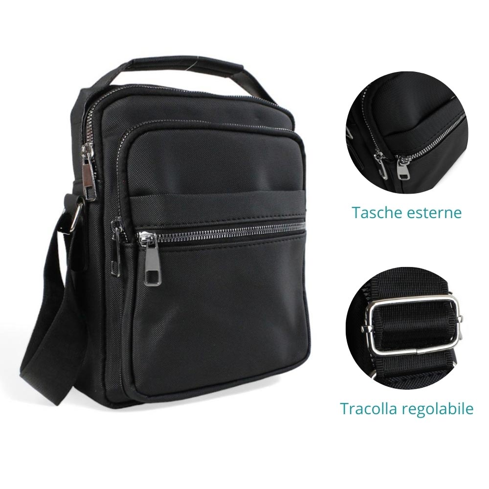 Borsello nero a tracolla con cerniere è dotato di 2 scomparti grandi chiusi con cerniera e 3 tasche, due sulla parte frontale ed una posta sul retro. Comoda la chiusura con bottone magnetico sulla parte frontale, utile per gli oggetti che necessiti di recuperare velocemente.