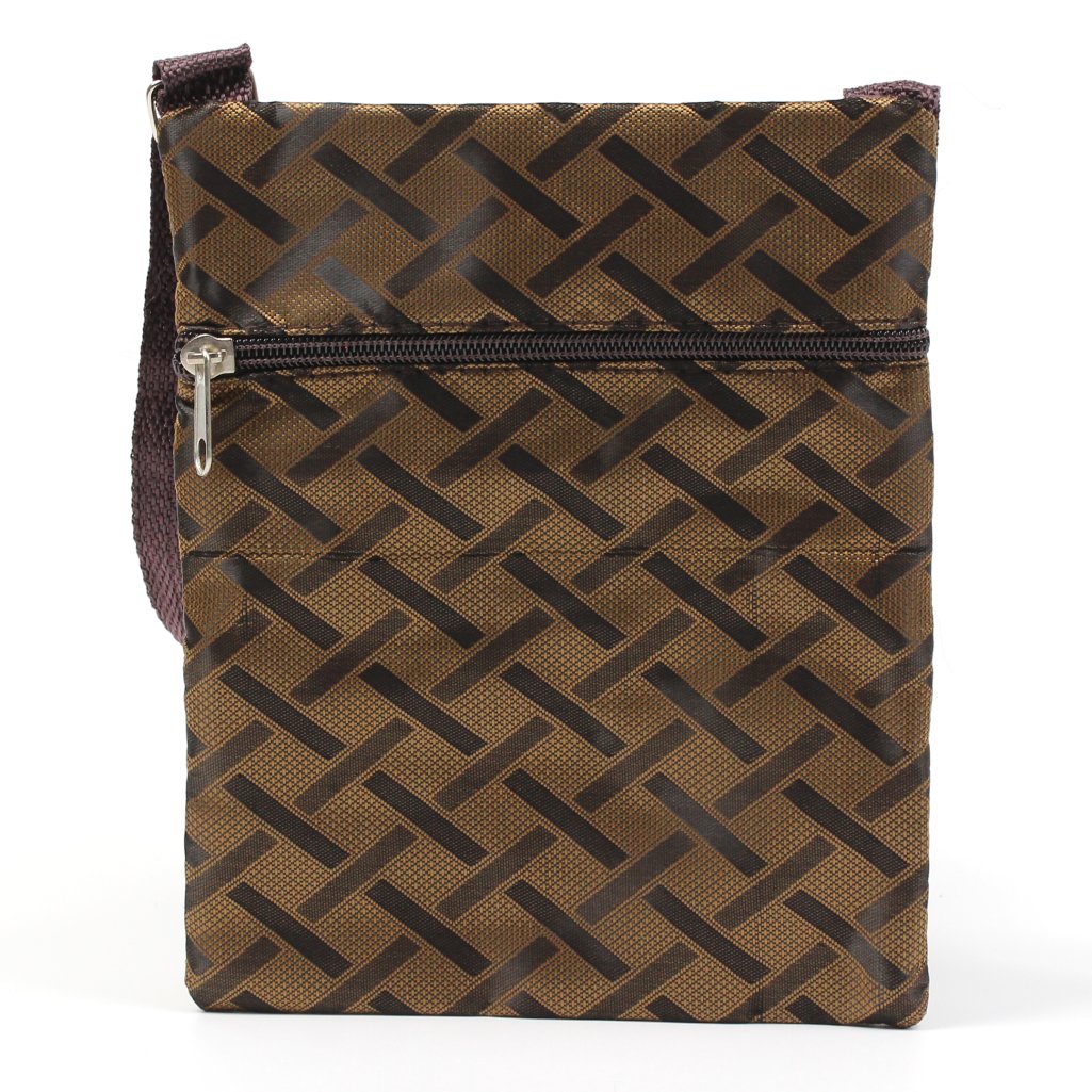 Borsello piccolo a tracolla marrone con fantasia geometrica, realizzato in materiale resistente, è dotato di una tracolla regolabile in tessuto per un trasporto comodo e sicuro. La parte frontale presenta due tasche con chiusura a zip e una tasca con bottone a pressione, ideali per tenere a portata di mano gli oggetti essenziali come smartphone, chiavi o documenti. Sul retro è presente una tasca aggiuntiva con chiusura a cerniera. Funzionale e versatile, è la scelta ideale per chi cerca un accessorio compatto senza rinunciare all’organizzazione.