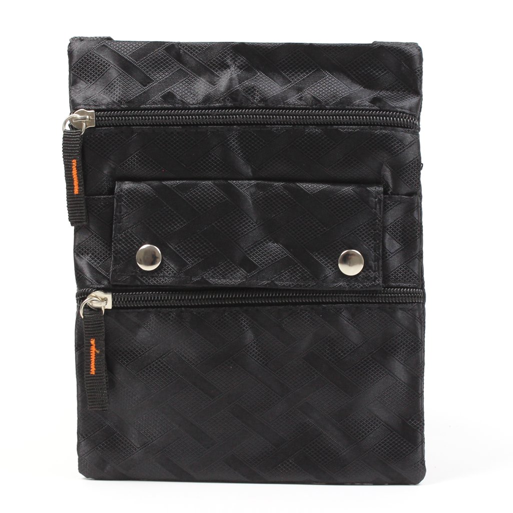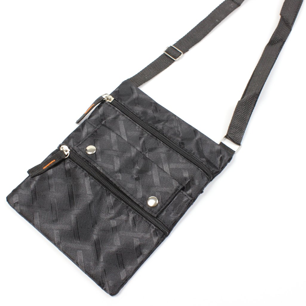 Borsello piccolo a tracolla nero con fantasia geometrica, realizzato in materiale resistente, è dotato di una tracolla regolabile in tessuto per un trasporto comodo e sicuro. La parte frontale presenta due tasche con chiusura a zip e una tasca con bottone a pressione, ideali per tenere a portata di mano gli oggetti essenziali come smartphone, chiavi o documenti. Sul retro è presente una tasca aggiuntiva con chiusura a cerniera. Funzionale e versatile, è la scelta ideale per chi cerca un accessorio compatto senza rinunciare all’organizzazione.