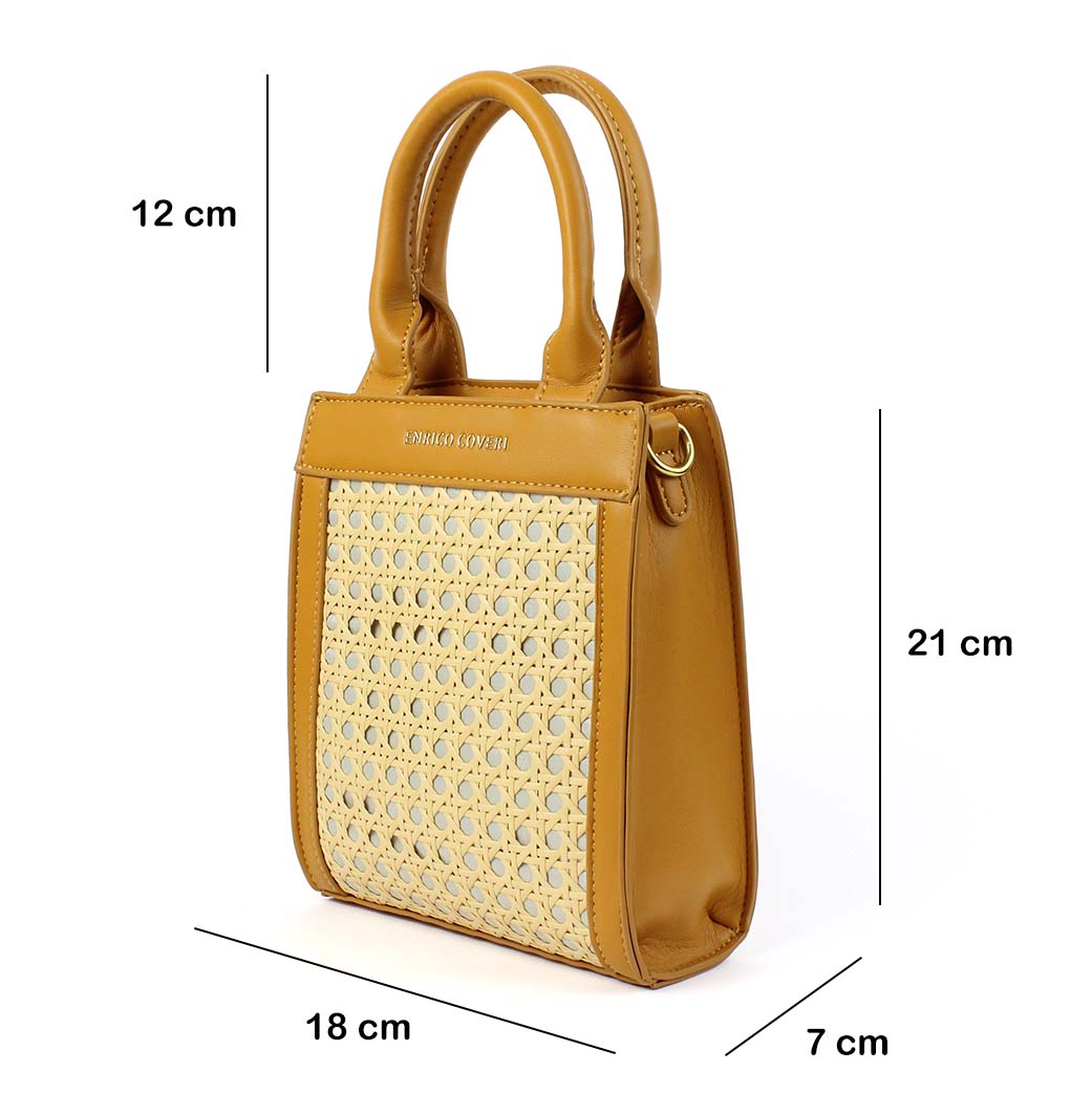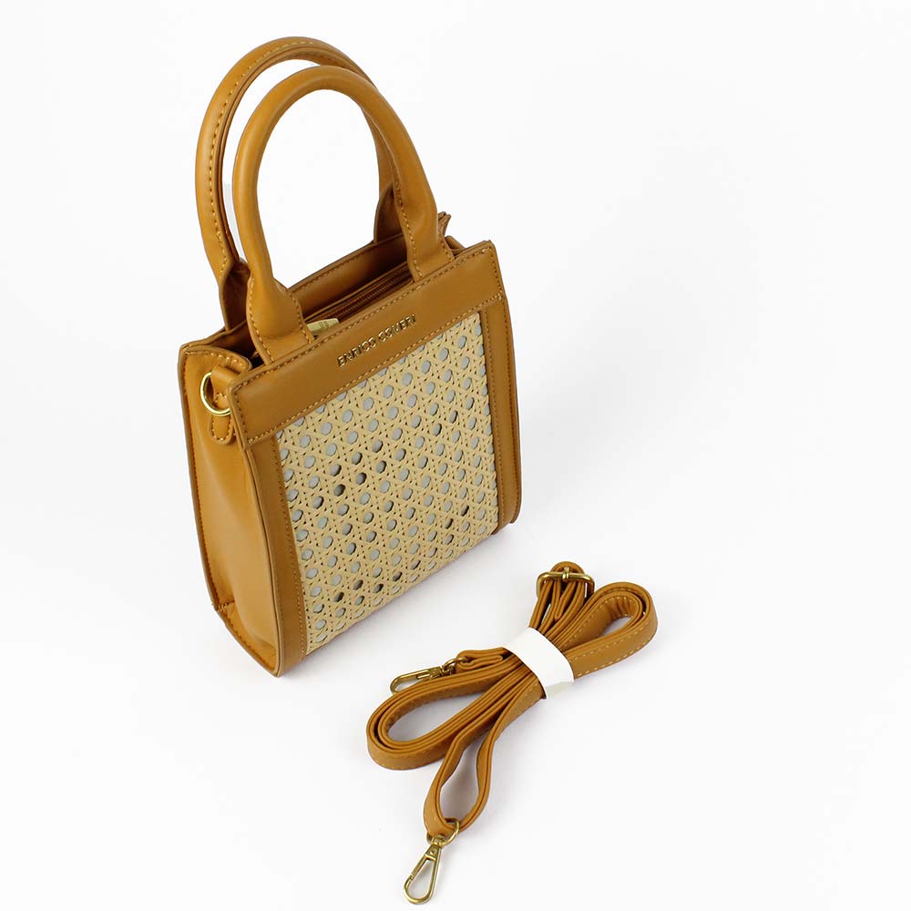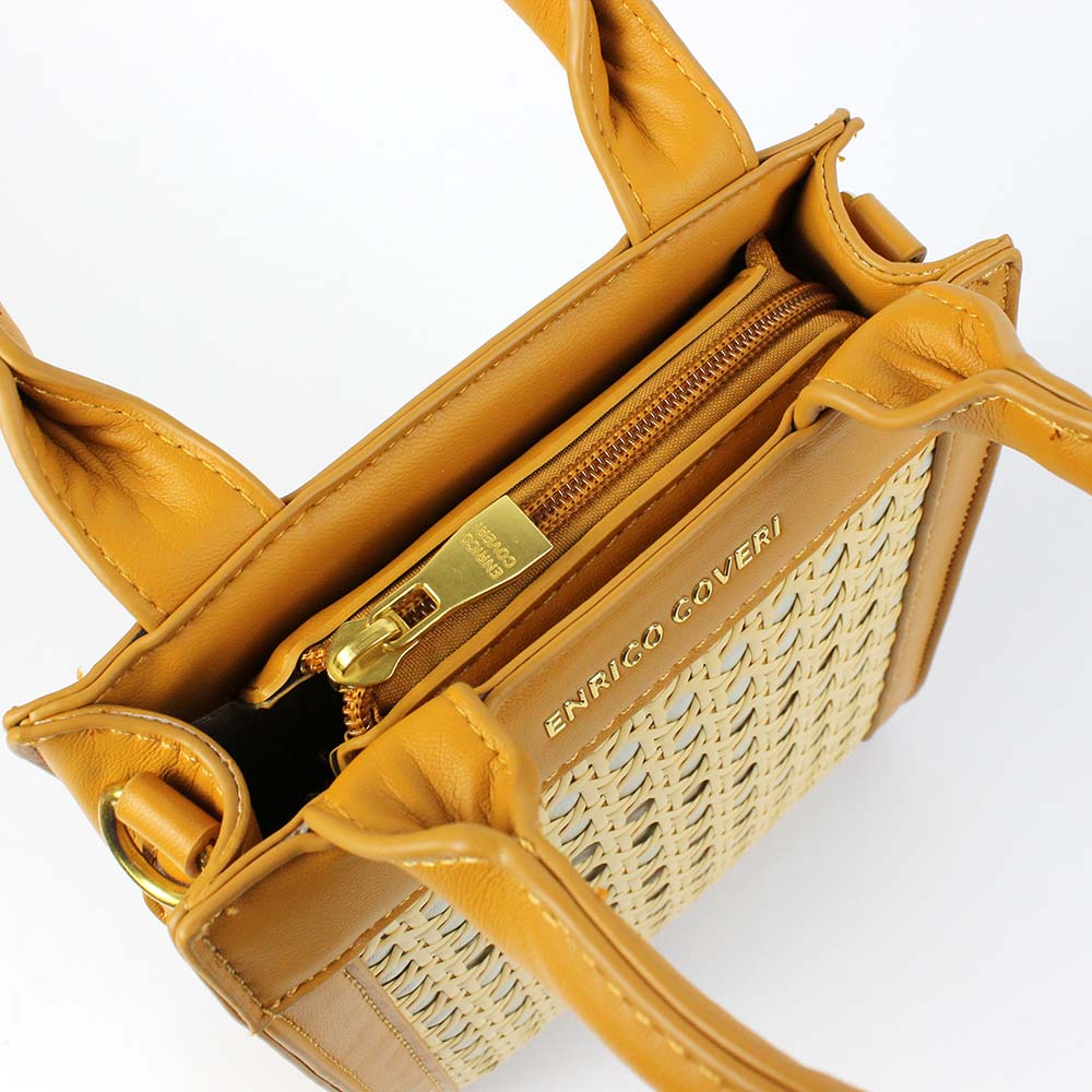 Borsetta Enrico Coveri marrone con fantasia paglia, un accessorio perfetto per ogni occasione. Realizzata in similpelle con motivo in paglia intrecciata e dettagli marroni e dorati, offre un design elegante e compatto. L’interno spazioso è foderato in tessuto beige e dispone di una tasca aperta ideale per riporre piccoli oggetti. La borsetta è dotata di un doppio manico robusto e di una tracolla regolabile e rimovibile, permettendo di portarla a mano, a spalla o a tracolla. La chiusura a cerniera garantisce la sicurezza dei tuoi effetti personali. Perfetta per completare qualsiasi outfit, dal casual chic al formale, questa borsetta diventerà il tuo accessorio moda preferito.