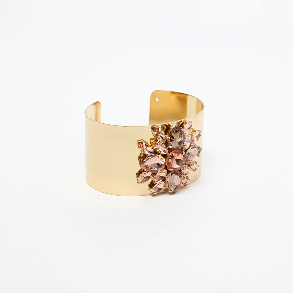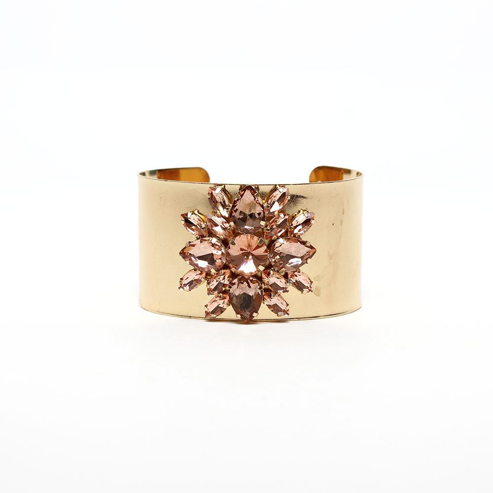 Bracciale a fascia con cristalli rosa Nina è composto da una base color oro lucida su cui troviamo incastonato un fiore di pietre sfaccettate.