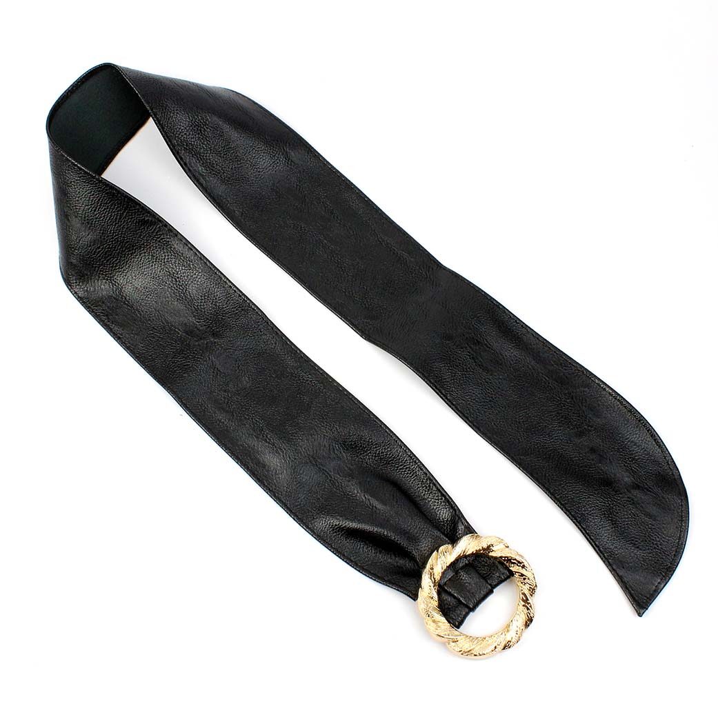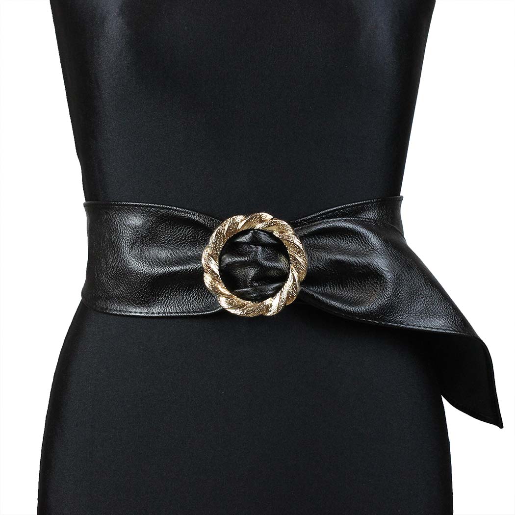 Cintura a fascia con fibbia nera in similpelle di alta qualità, la cintura presenta una fibbia rotonda in acciaio inossidabile colore oro. La cintura misura 105 x 8,5 cm e può essere regolata alla larghezza desiderata. Ideale per rendere più particolare un outfit basic o casual.