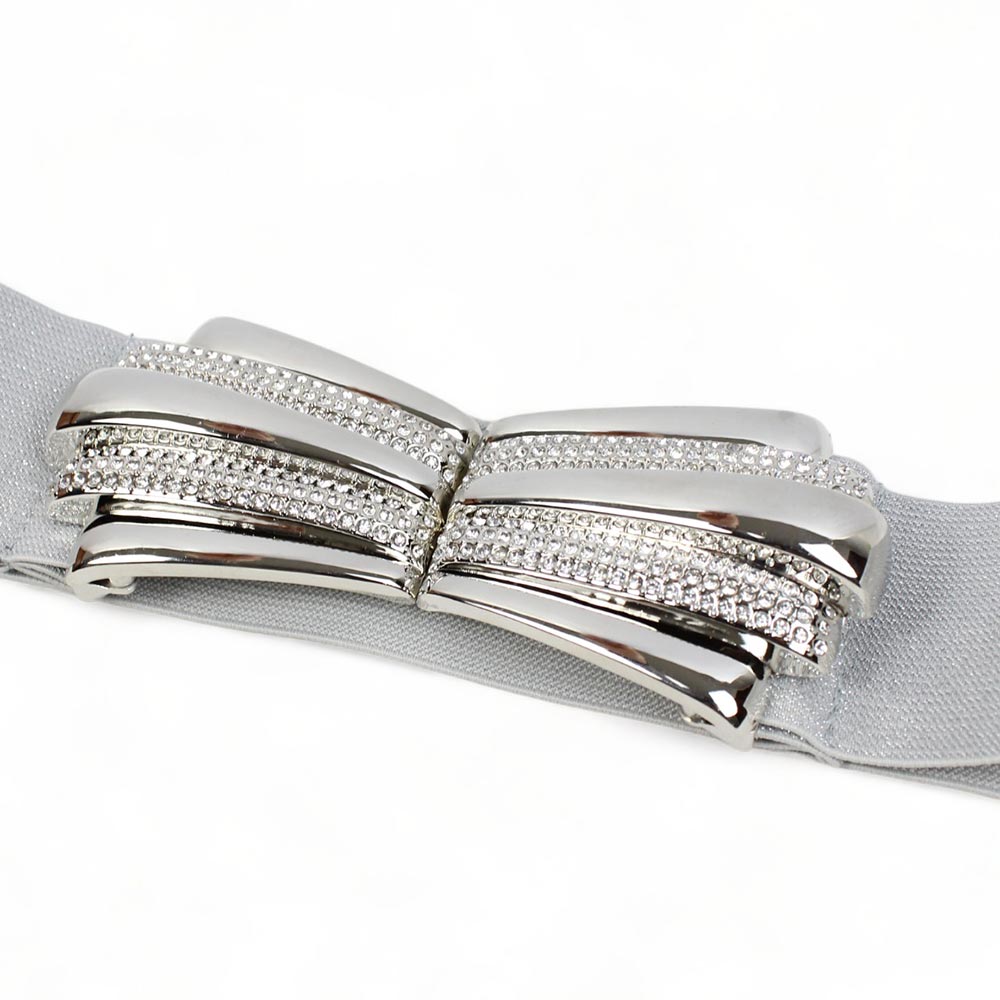 Cintura elastica con strass argento è composta da una doppia fibbia in metallo ricoperta di strass ed una fascia elastica.