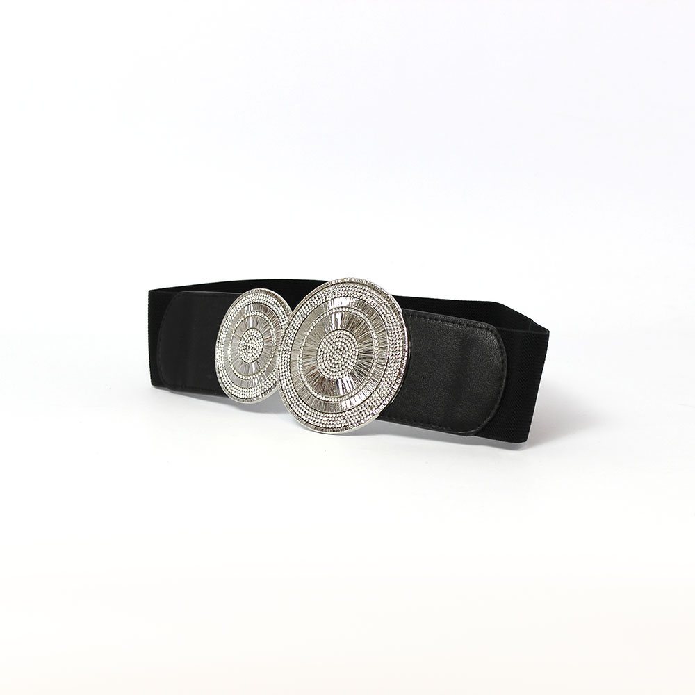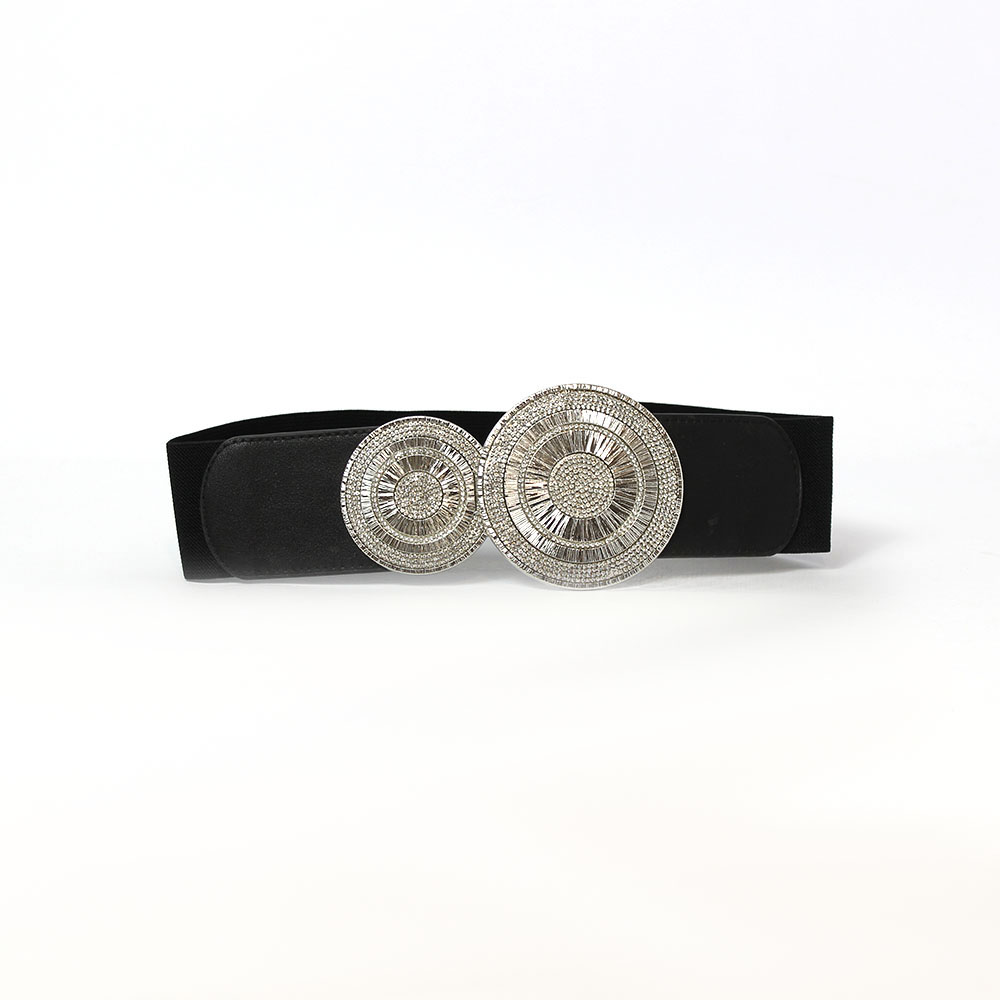 La particolare fibbia in metallo tonda color argento è ricoperta di strass e crea un originale e sofisticato motivo geometrico di cerchi concentrici.