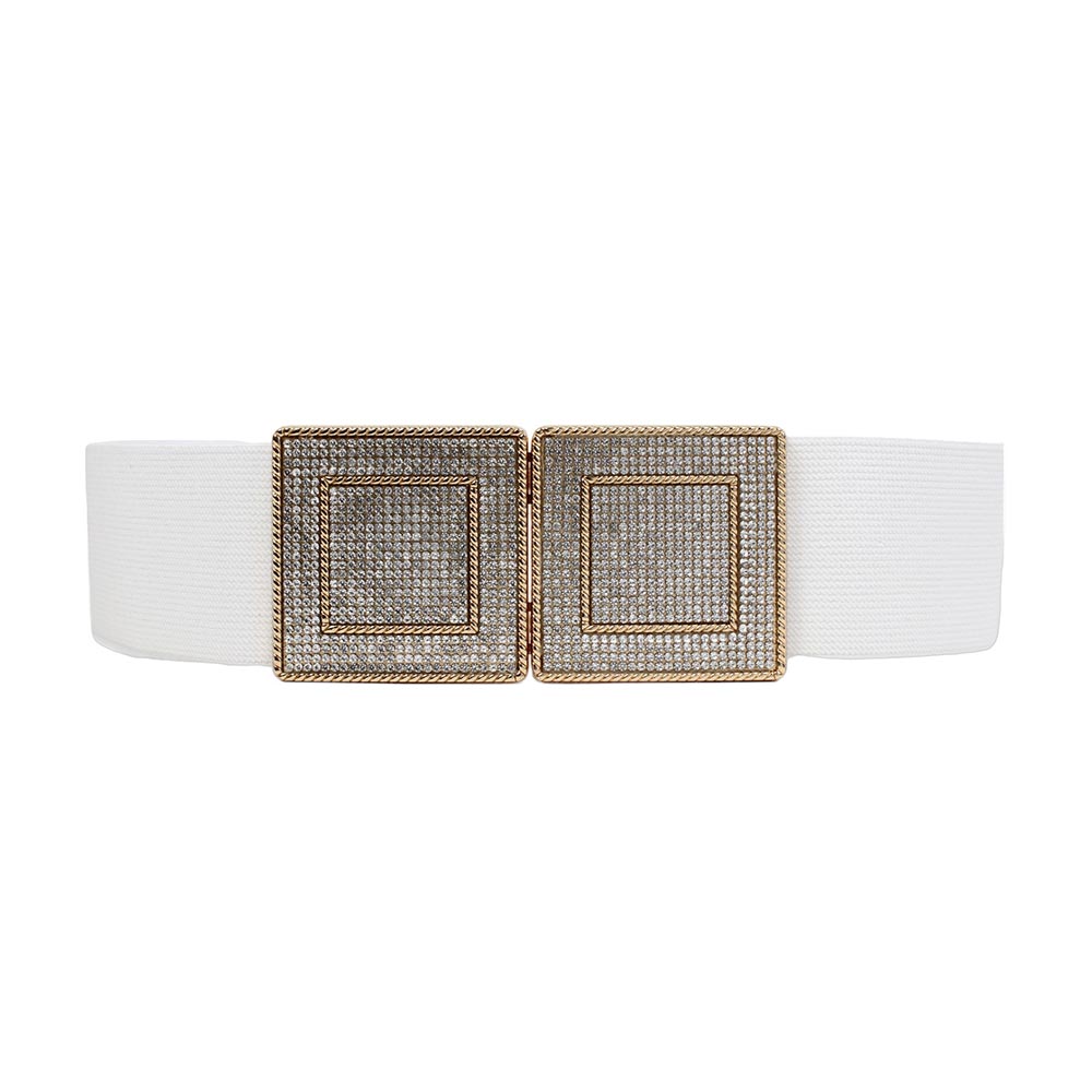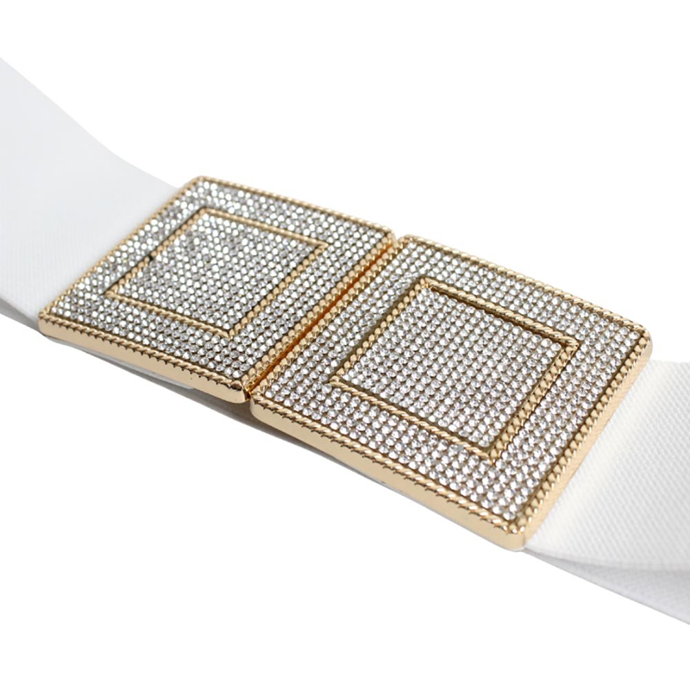 Cintura larga elastica bianca con strass Silvia è composta da una fascia elastica bianca con una doppia fibbia ricoperta di strass e rifiniture metalliche in color oro.