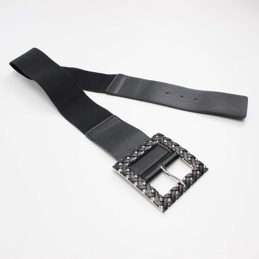 Cintura nera con fibbia quadrata elastica Evelyn presenta un design elegante e moderno, caratterizzato da una larga fascia in materiale elastico che assicura una vestibilità confortevole e versatile. La fibbia quadrata con decorazioni a piccoli motivi metallici argentati, dona un tocco di raffinatezza e originalità. Il meccanismo di chiusura è ad ardiglione, permettendo un facile fissaggio e regolazione della cintura tramite i fori presenti sulla fascia. Perfetta per completare outfit casual o più formali.