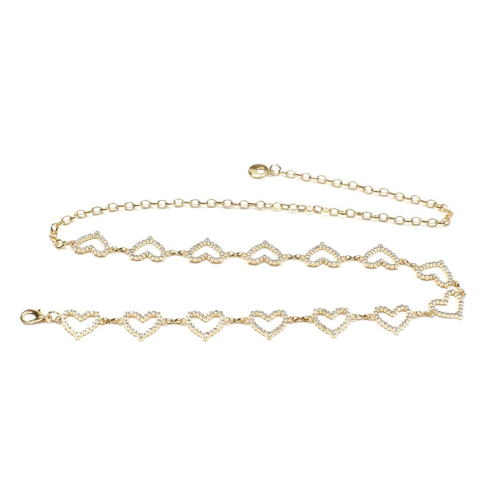 Cintura oro con cuori in strass Delizia, regolabile da una lunghezza minima di 60 fino ad un massimo di 110 cm grazie alla catenina di 50 cm. Ideale per completare look da feste e cerimonie.