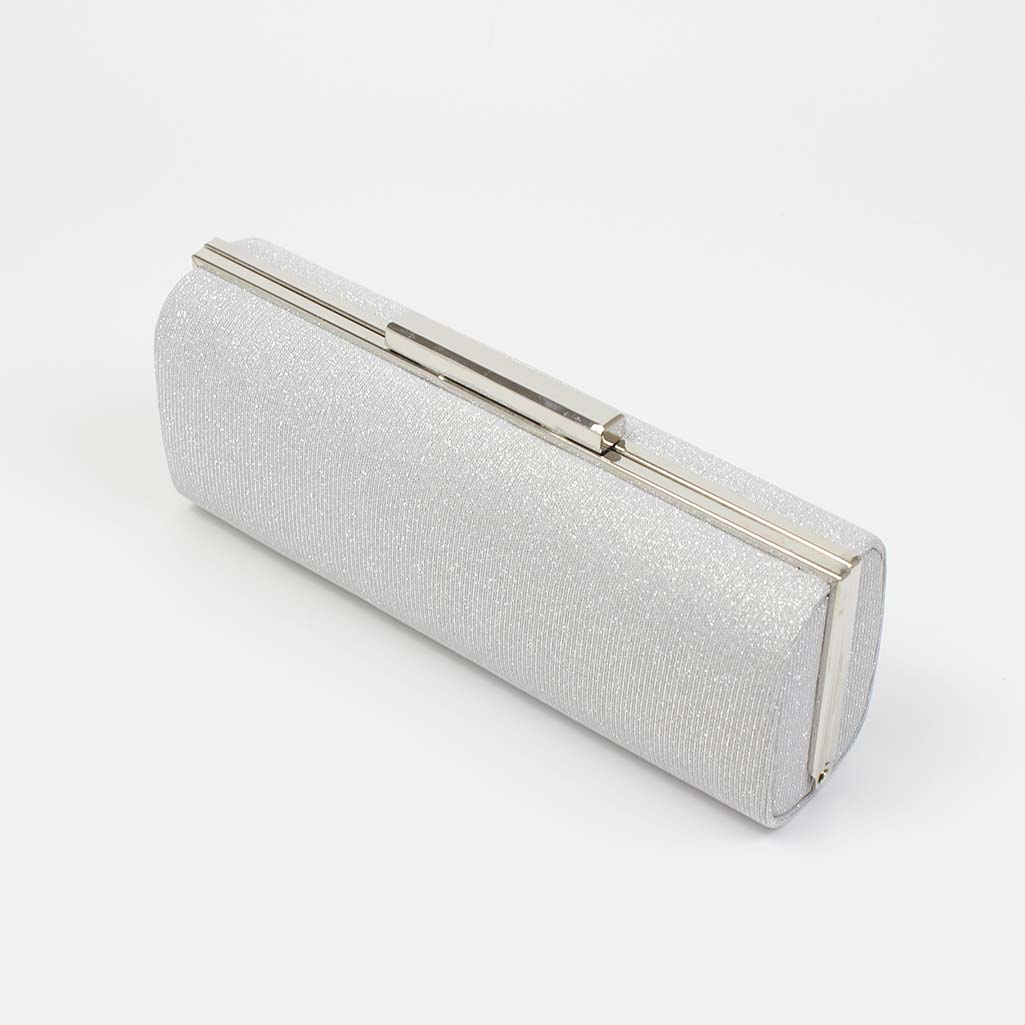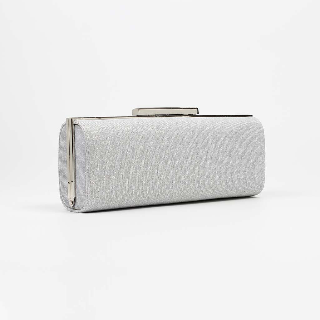 Clutch baguette argento con glitter Zaira è realizzata con un raffinato tessuto glitterato, offre un tocco di luminosità e eleganza che completa qualsiasi look. La chiusura superiore metallica garantisce sicurezza e praticità, mentre l’interno spazioso è ideale per contenere gli oggetti essenziali della serata, come smartphone, trucchi e piccoli accessori. La clutch è dotata di una catena rimovibile in metallo argentato, che consente di portarla a spalla o a tracolla per maggiore comodità. Un accessorio versatile e chic, perfetto per un look elegante e raffinato.