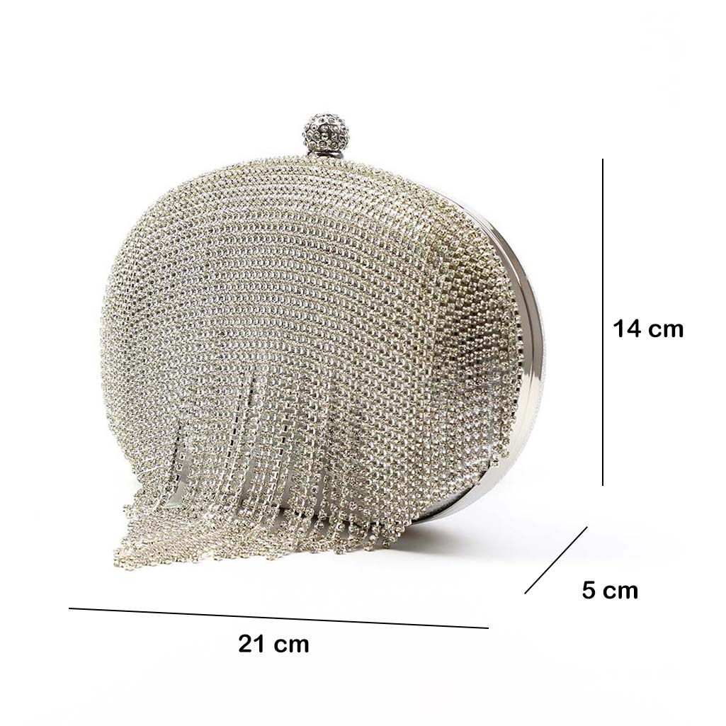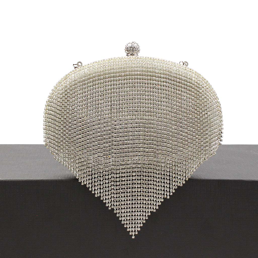 Clutch ovale argento con strass Olga è realizzata con una lavorazione ricca di strass che ricopre l’intera superficie, conferendole una brillantezza unica. Le frange di strass pendenti nella parte inferiore creano un effetto cascata che aggiunge movimento e originalità al design. La chiusura a scatto, raffinata e pratica, è abbinata a una fodera interna in argento, che dona un tocco di lusso anche all’interno della borsa. La clutch è dotata di un manico superiore alto 9 cm rimovibile e di una tracolla a catena, che permette di indossarla anche a spalla, garantendo versatilità e stile in ogni occasione. Clutch ovale argento con strass Olga è ideale per completare abiti da sera o look da cerimonia.