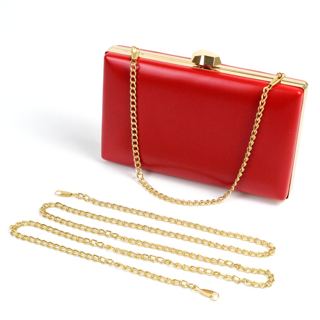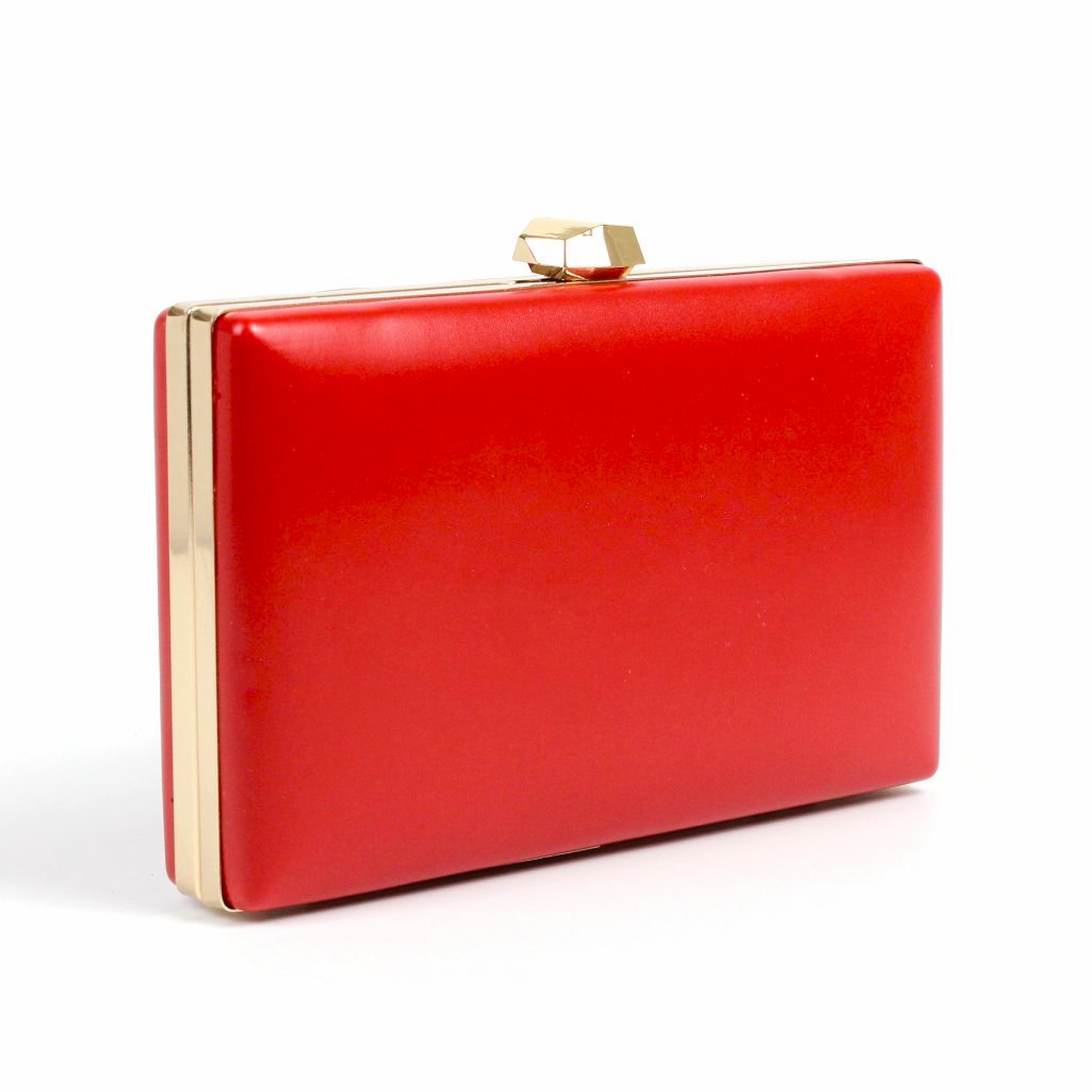 Clutch rossa e oro in similpelle Michelle Moon. All’interno troviamo un unico scomparto con fodera in raso rosso, la pochette è dotata di manico a catena e di tracolla, ideale per portarla sia a mano che a spalla. Rigida e compatta con finiture oro, perfetta per outfit eleganti, feste e cerimonie.