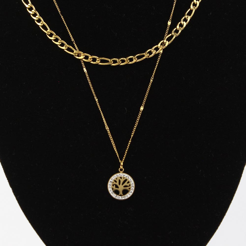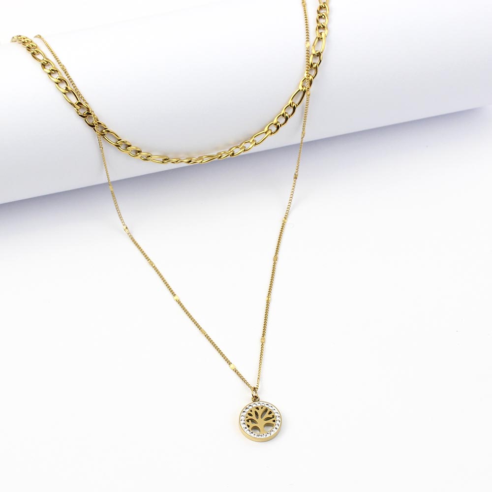 Collana con doppia catena in acciaio e albero della vita, simbolo di nascita e rinascita. È un augurio per chi sta per iniziare una nuova vita, un’idea regalo come portafortuna.