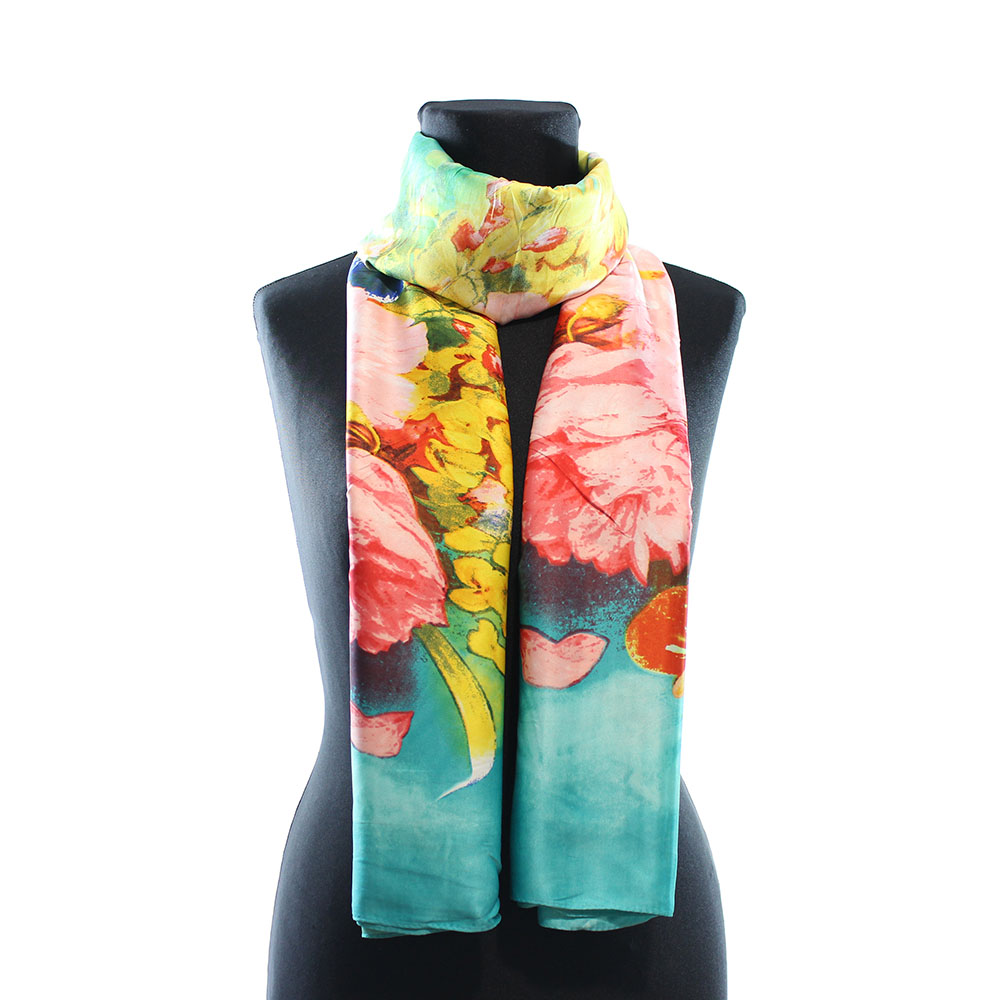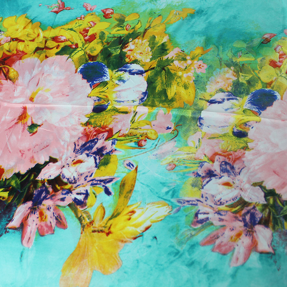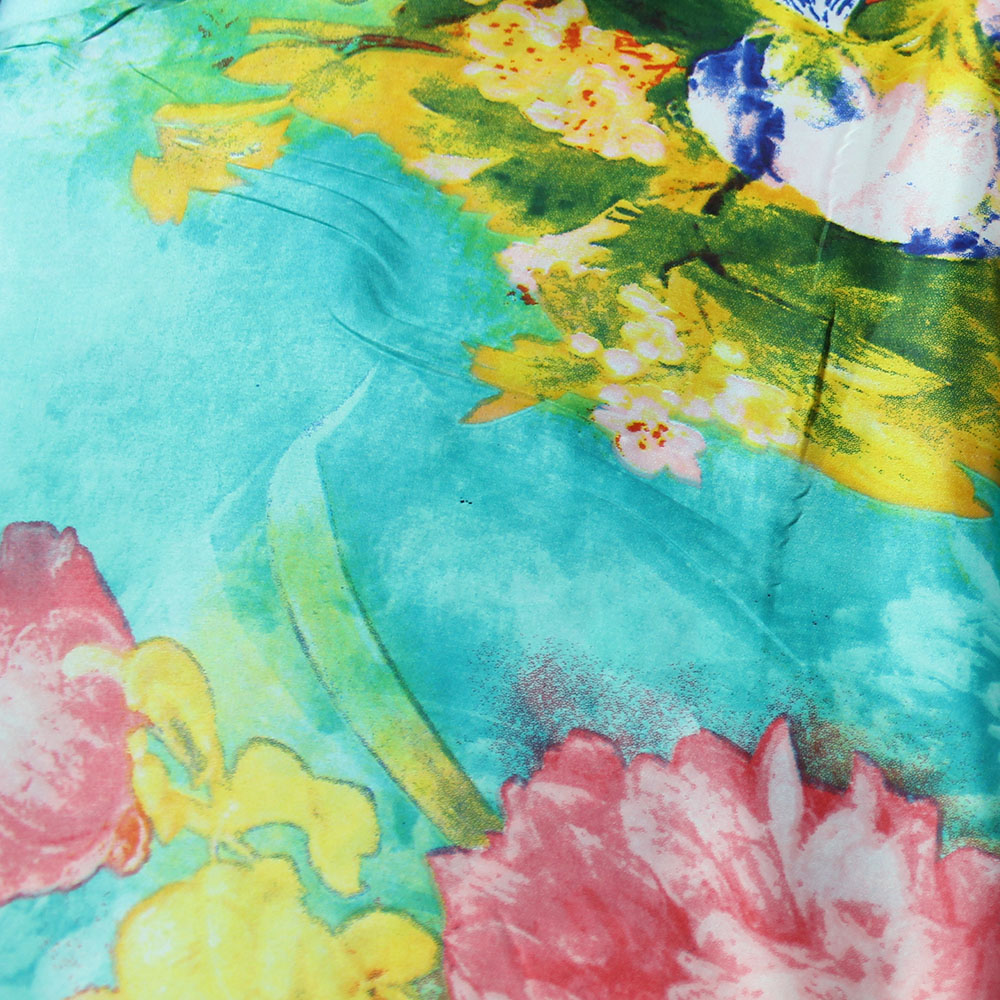 Foulard seta floreale azzurro Camelia è 100% in mano seta con particolare fantasia multicolore.