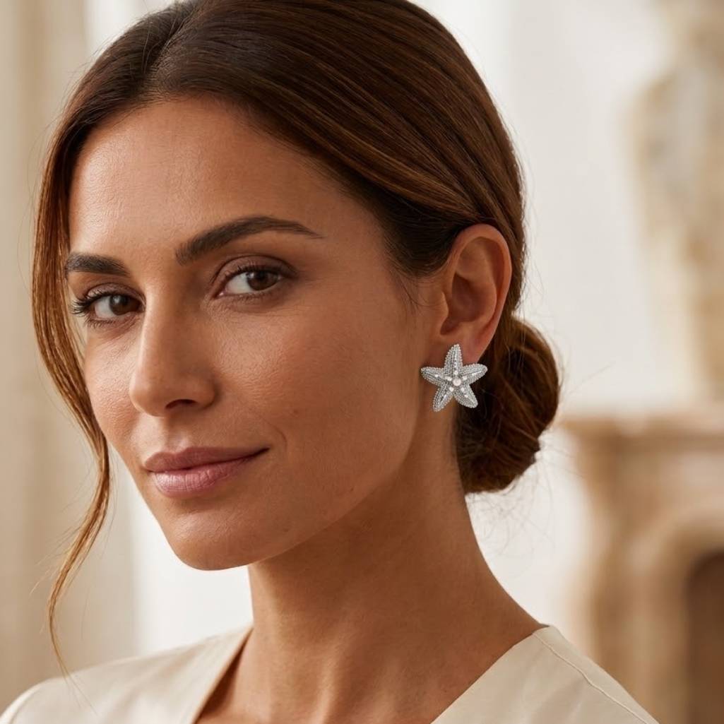 Orecchini argento con perline Stella Marina realizzati in acciaio inossidabile e perline. Con una dimensione di 2,5 cm, sono ideali per aggiungere un tocco di stile sia agli outfit quotidiani che alle occasioni speciali.
