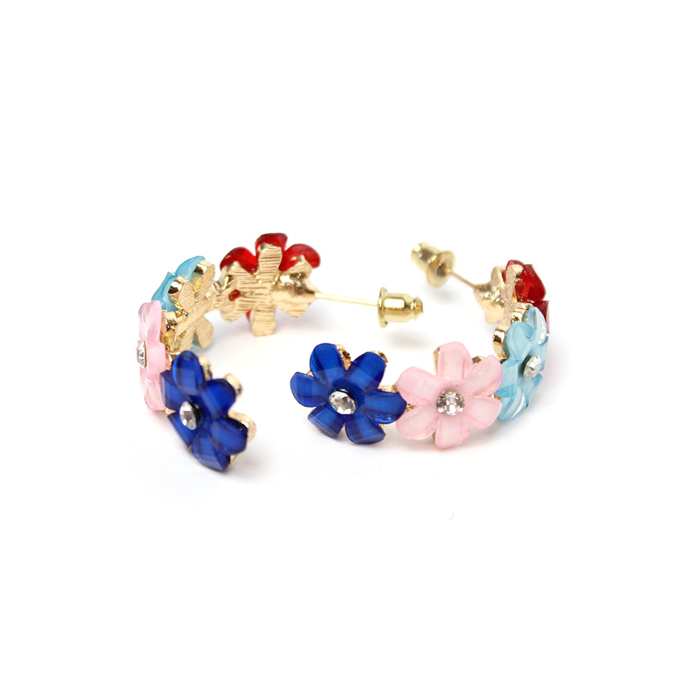 Orecchini Fiori colorati con pietre sfaccettate sono composti da quattro fiori in pietre sfaccettate luminose che creano un affascinante gioco di luci. Fiori colorati misura 3cm ed ha la forma di una mezzaluna essendo un orecchino a metà cerchio. Quattro punti luce incastonati nei quattro fiori donano ancora più luce. La chiusura è a perno