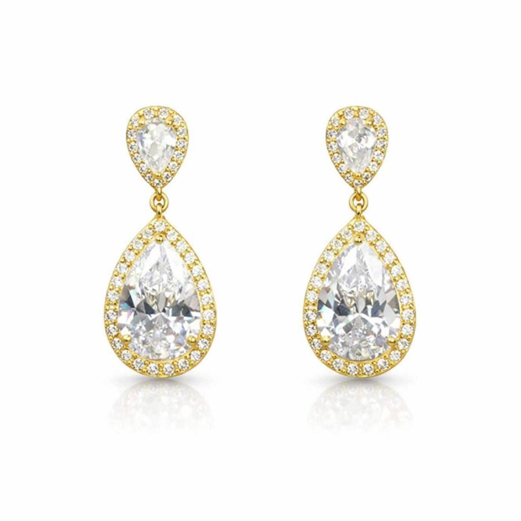 Orecchini pendenti con cristalli oro Isa con chiusura a perno, realizzati in pietra Cubic Zirconia, circondati da piccoli strass luminosi.