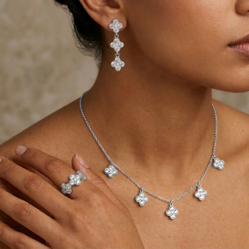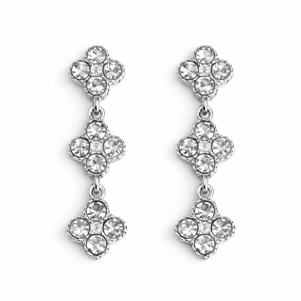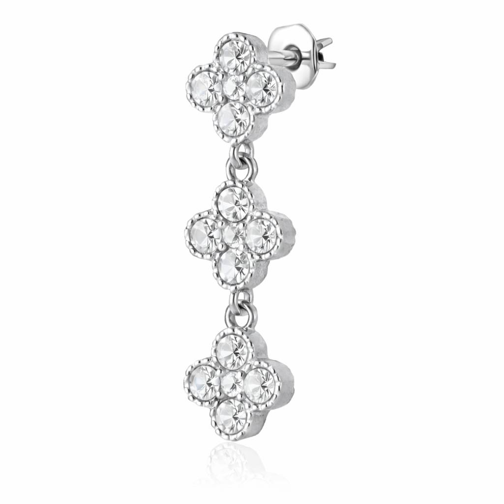Orecchini pendenti eleganti argento Lucky dal design luminoso e raffinato, lungo 3 cm, perfetto per valorizzare il viso. La struttura presenta una sequenza armoniosa di elementi decorativi a forma di fiore, impreziositi da piccoli cristalli che catturano la luce e donano brillantezza ad ogni movimento. Realizzato in acciaio inossidabile, garantisce resistenza, durata nel tempo e comfort sulla pelle, mantenendo la sua lucentezza anche con un uso quotidiano. Ideale sia per occasioni speciali che per aggiungere un dettaglio sofisticato agli outfit di tutti i giorni.