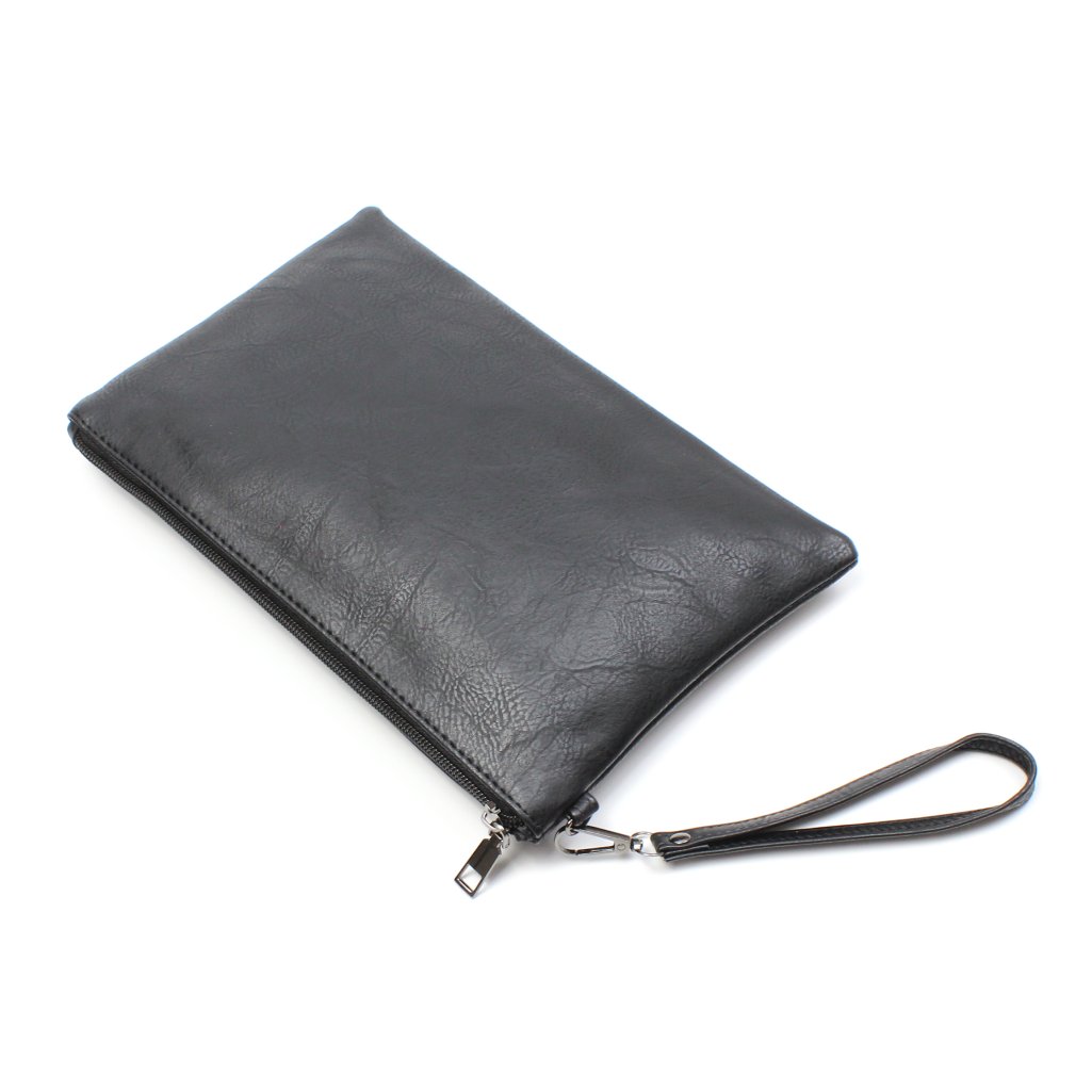 Pochette a busta nera in similpelle foderata in colore nero con tasca posteriore con cerniera. La pochette è composta da un unico scomparto ampio e un comodo laccetto da polso rimovibile.