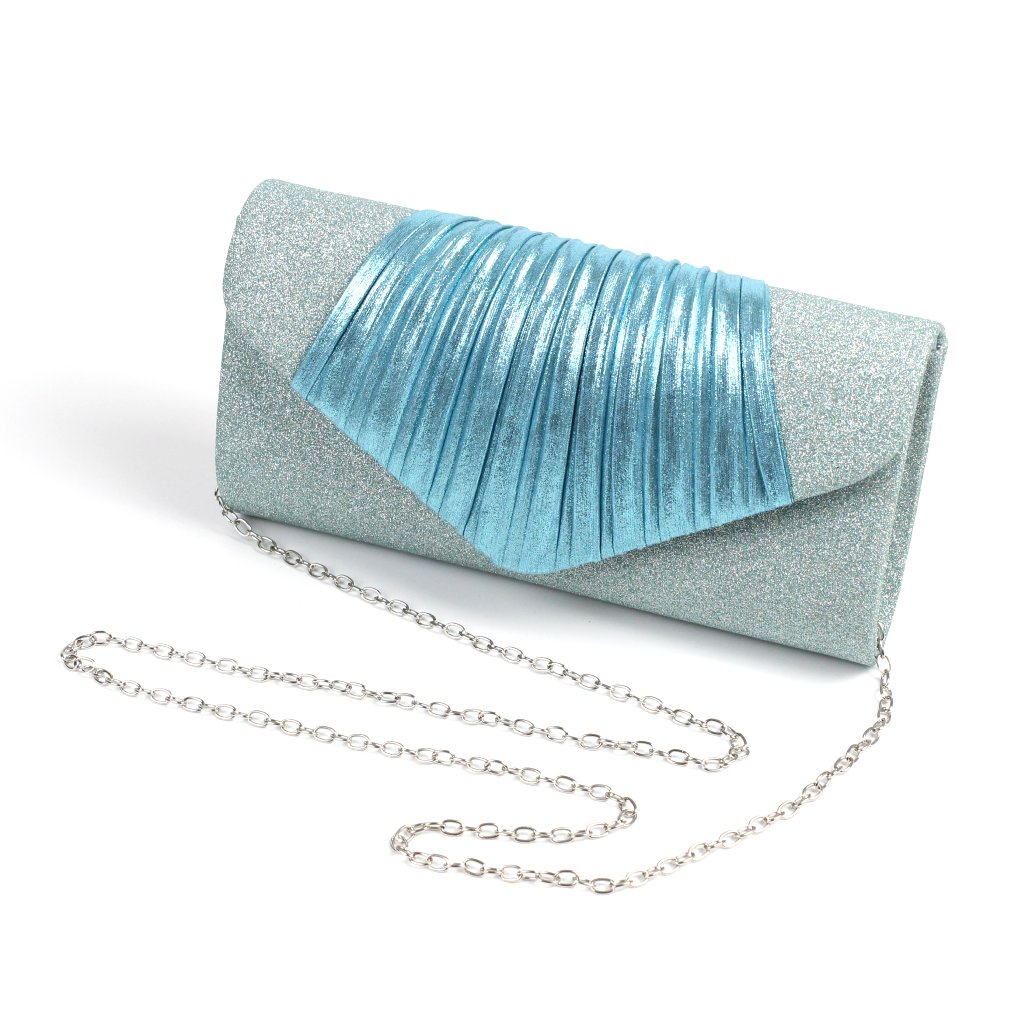 Pochette blu chiaro con brillantini Michelle Moon, all’interno troviamo un unico scomparto con fodera celeste e tasca a soffietto. La chiusura è con bottone magnetico ed e dotata di tracolla a catenina rimovibile. Perfetta per outfit da festa e cerimonia.