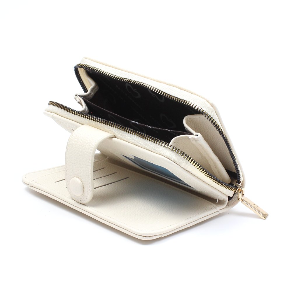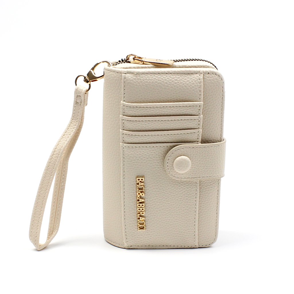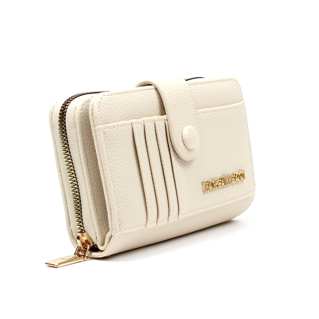 Portafoglio beige Baci e Abbracci con cerniera realizzato in morbida similpelle con logo frontale. Dotato di 10 scomparti per carte e tessere, uno scomparto per banconote, 3 tasche per documenti e assegni, un comodo scomparto con cerniera per un accesso rapido, perfetto sia per le monete che per le banconote.