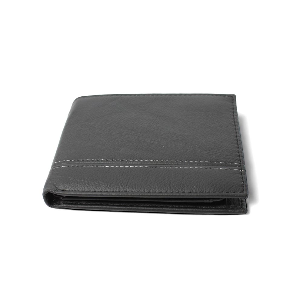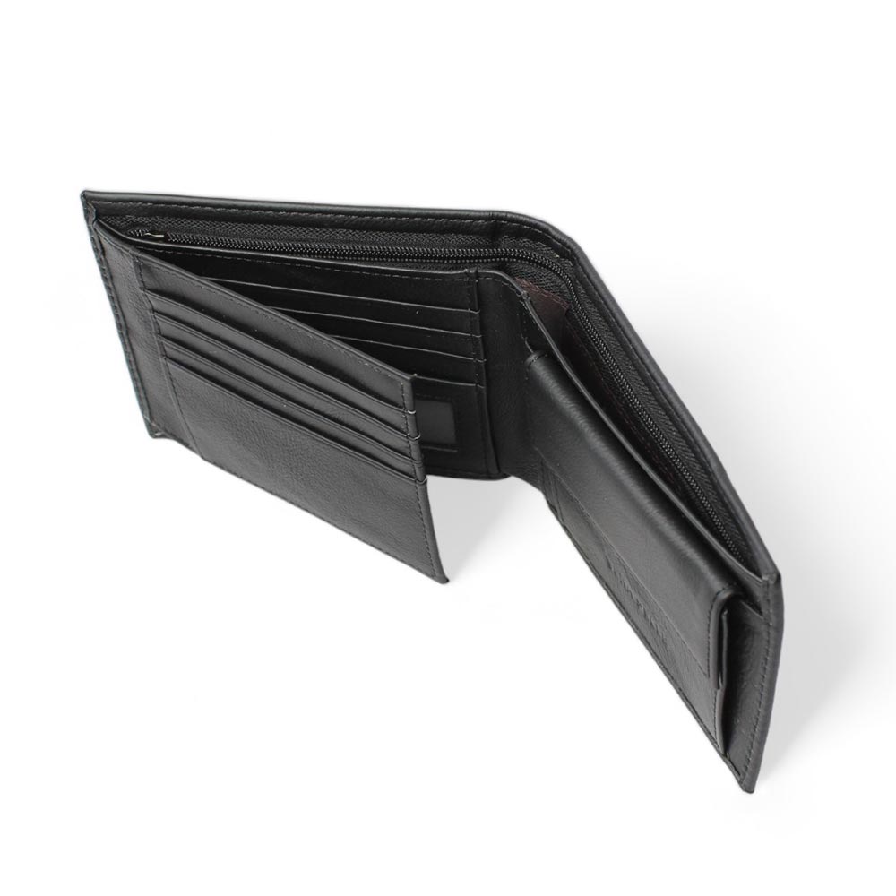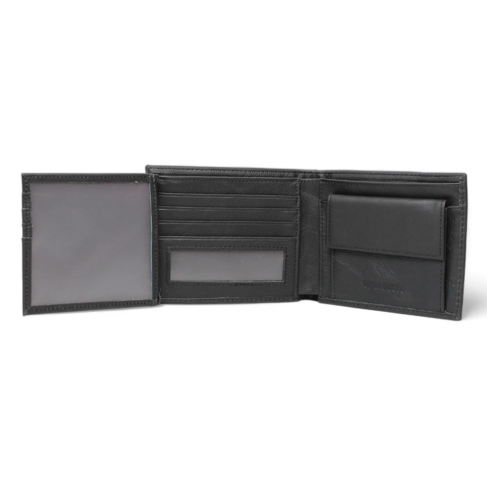 Portafoglio nero in vera pelle tre ante è dotato di tutti i comfort, tasche porta tessere, portafoto e carte di credito, ha inoltre una ribaltina con portafoto e due scomparti porta banconote di cui uno con cerniera.