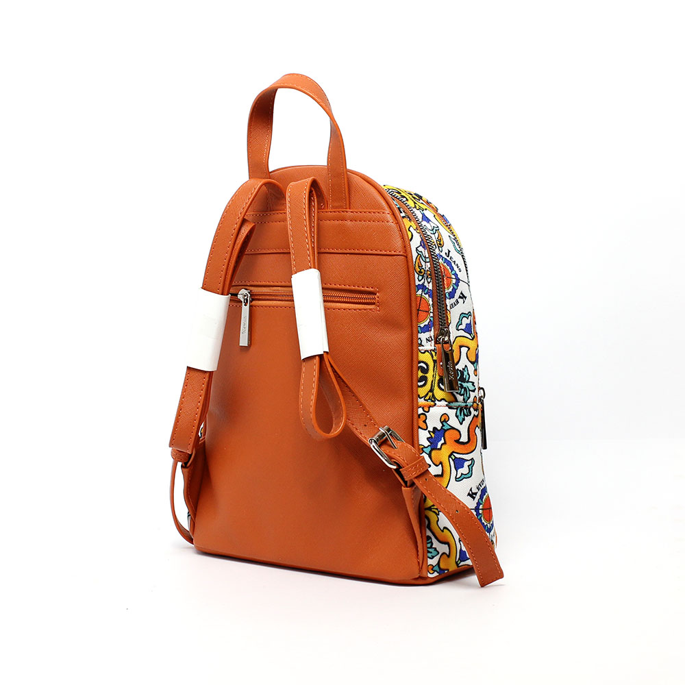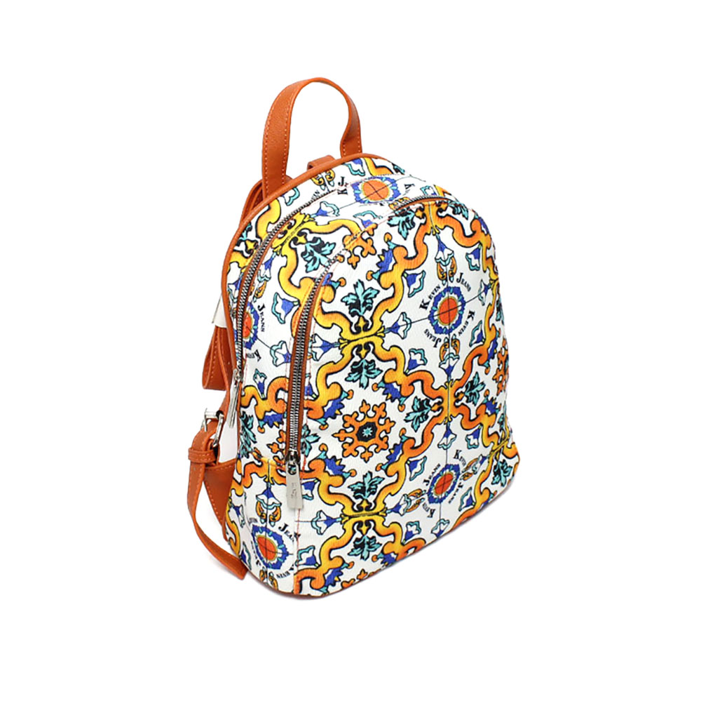 Zaino arancione Kevin Jeans Maioliche è realizzato in pelle sintetica e tessuto, con particolare fantasia maiolica.