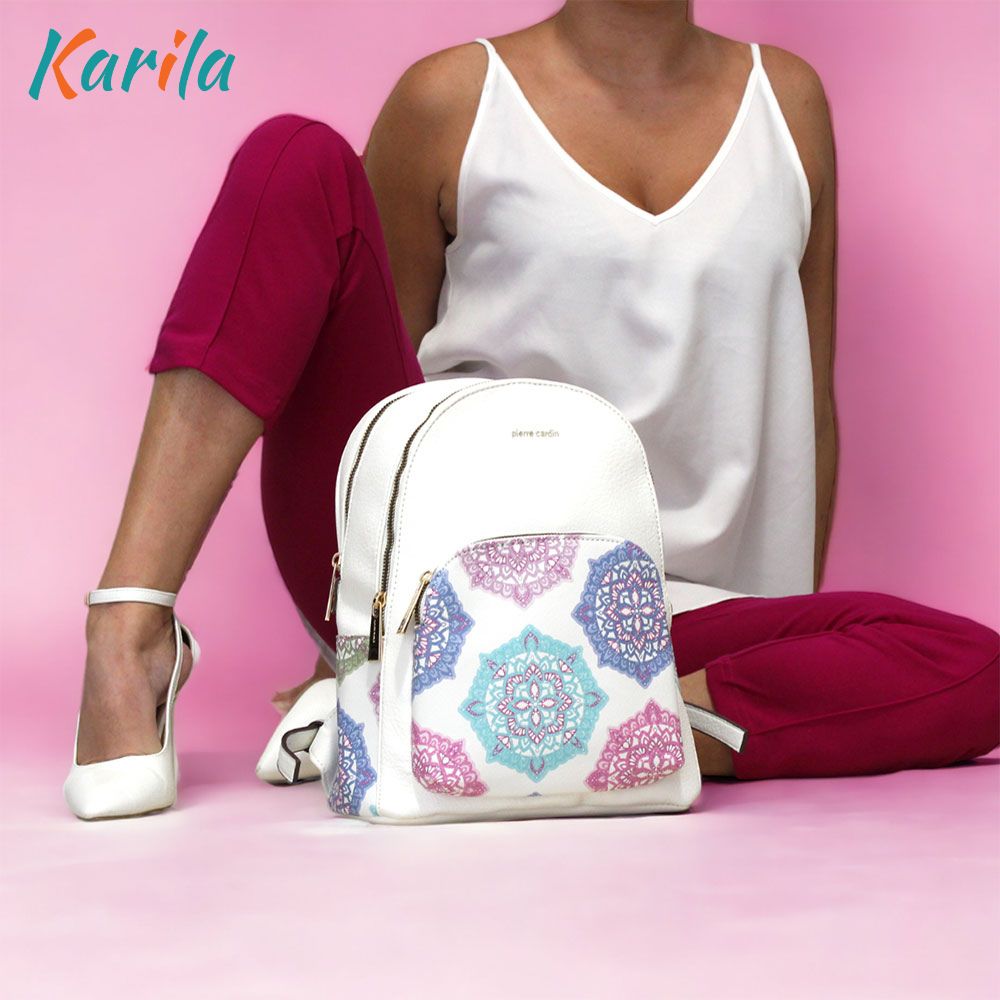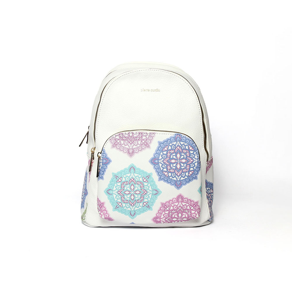 Zaino Pierre Cardin bianco Flowers è realizzato in pelle sintetica di alta qualità, con particolare fantasia floreale e geometrica.